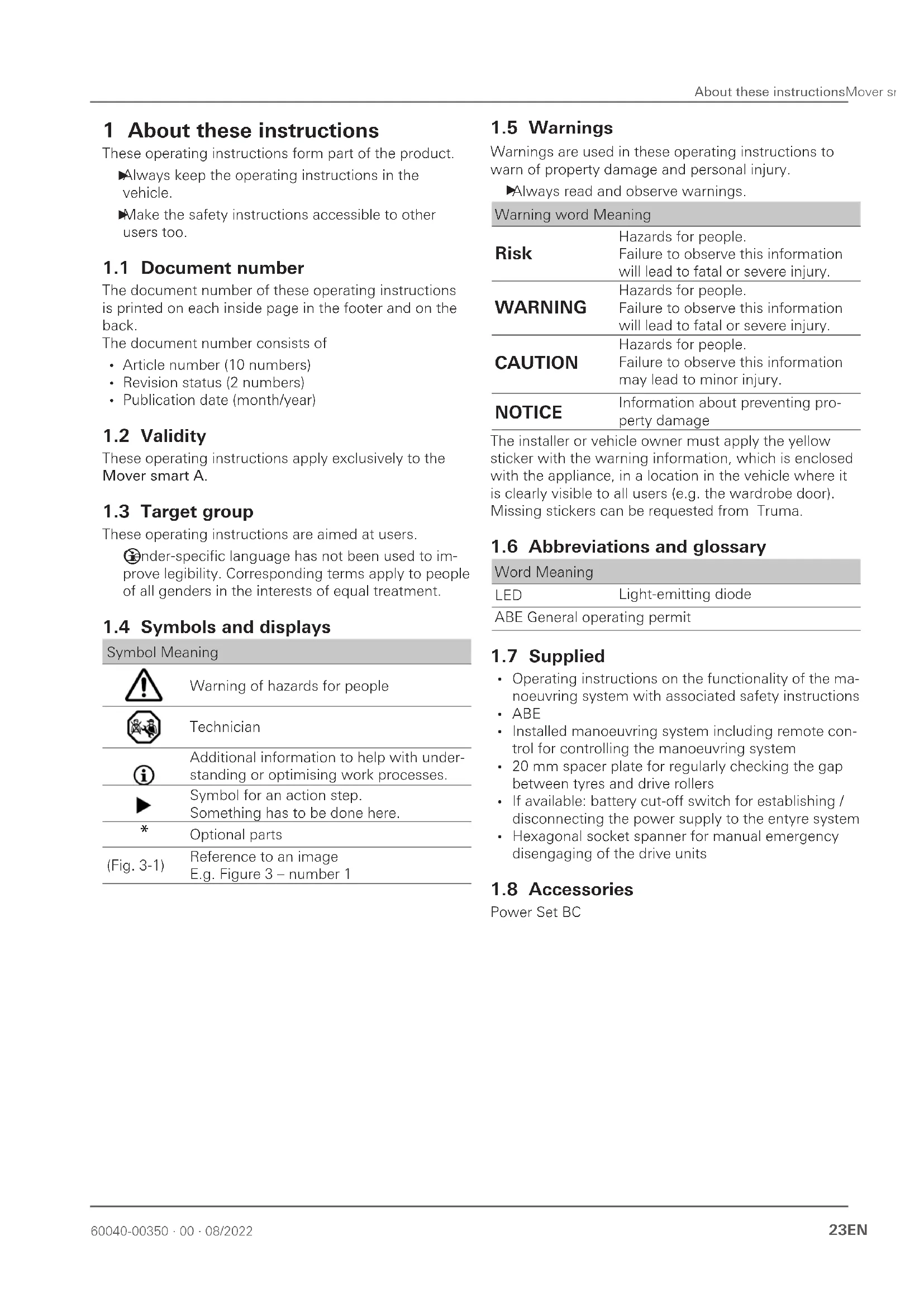 Table of contents 1 About these instructions 23 11 Document number 23 12 Validity 23 13 Target group 23 14 Symbols and displays 23 15 Warnings 23 16 Abbreviations and glossary 23 17 Supplied 23 18 Accessories 23 2 Safety instructions 24 21 General safety 24 22 Obligations of the operator / vehicle owner 24 23 Safe operation 24 24 What to do if malfunctions occur 25 3 Intended use 25 31 Proper use 25 32 Use that is not compliant with the intended pur- pose 25 33 Installation, removal, conversion 25 4 Product description 26 41 Setup 26 42 Product label 27 43 Function 27 44 Power supply 27 45 Remote control 27 5 Operation 29 51 Uncoupling the towing vehicle 29 52 Switch on the manoeuvring system 29 53 Engage the manoeuvring system 30 54 Manoeuvring the caravan 31 55 Coupling to the towing vehicle 32 56 Disengage the manoeuvring system 33 57 Disengage the manoeuvring system manually (emergency disengagement) 34 58 Switch off the manoeuvring system 34 6 Malfunctions 35 61 Troubleshooting guide 35 62 Pairing the electronic control unit with the radio remote control 36 7 Care and maintenance 36 71 12V battery care 36 72 Remote control care 36 73 Tyre care 37 74 Drive unit care 37 75 Maintaining the manoeuvring system 37 76 Maintaining the tyres 37 77 Maintaining the control unit 37 78 Check the gap between the rollers and the tyres 37 79 Standstill for an extended period of time 37 8 Repair 38 9 Disposal and recycling 38 91 Disposing of the manoeuvring system 38 92 Disposing of remote control and batteries 38 10 Technical data 39 11 Warranty 39 111 Scope of Manufacturer's Warranty 39 112 Exclusion of warranty 40 113 Making a warranty claim 4060040-00350 ∙ 00 ∙ 08/2022 About these instructionsMover smart A 23EN 1 About these instructions These operating instructions form part of the product Always keep the operating instructions in the vehicle Make the safety instructions accessible to other users too