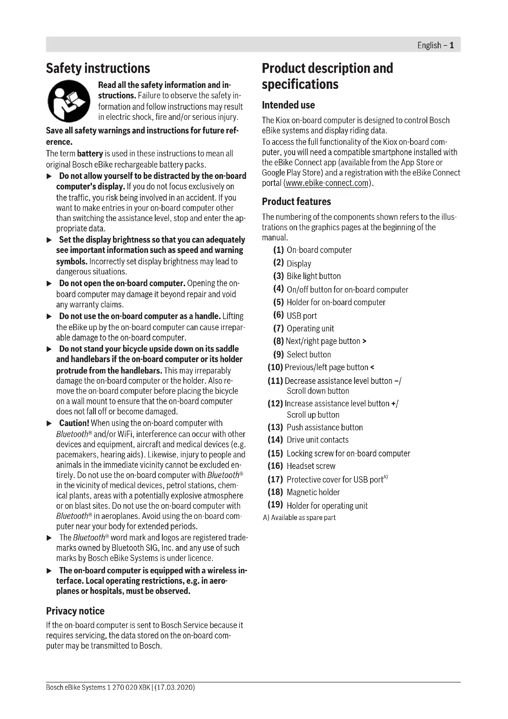 IPx7 Weight, approx. g 60 Bluetooth®Low Energy – Frequency MHz 2400–2480 – Transmission power mW <10 A) At an ambient temperature of <25 °C B) Not included as part of standard delivery C) When the USB cover is closed Declaration of Conformity Robert Bosch GmbH, Bosch eBike Systems, hereby declares that the Kiox radio communication unit complies with Dir- ective 2014/53/EU. The full text of the EU Declaration of Conformity can be accessed at the following Internet ad- dress: https://www.ebike-connect.com/conformity Fitting Fitting and removing the on-board computer (see figureA) Fit the lower part of the Kiox into the holder(5) first and tilt it forward gently until you can feel that the on-board com- puter is firmly fixed in the magnetic holder. To remove the on-board computer, hold it by the top end and pull it towards you until it disengages from the magnetic holder. u Remove the on-board computer when you park the eBike. The on-board computer can be secured in place to prevent it from being removed from the holder. To do this, loosen the headset screw(16) until the Kiox holder can be swivelled sideways. Put the on-board computer in the holder. Screw the locking screw (M3 thread, 6mm long) from below into the thread provided in the on-board computer (using a longer screw may damage the on-board computer). Swivel the holder back into place and tighten the headset screw in accordance with the manufacturer's specifications. Operation Before initial commissioning The Kiox is supplied with a partially charged battery. Before using it for the first time, this battery must be charged for at least one hour via the USB port (see "Power supply of the on- board computer", pageEnglish – 3) or via the eBike sys- tem. The control unit should be attached such that the buttons are almost perpendicular to the handlebars. When using the on-board computer for the first time, the lan- guage selection page is displayed initially. You can then choose to have essential functions and indications explained via the <Intro to Kiox> menu item. The menu item can also be called up at a later time via <Settings>→ <Informa- tion>. Selecting system settings Fit the on-board computer in the holder and proceed as fol- lows with the bicycle stationary: Go to the status page (use the <button(10) on the control unit to get to the first display) and call up the <Settings> with the select button. You can use the –(11) and +(12) buttons to select the set- ting you want. You can open the settings, as well as any addi- tional submenus, using the select button(9). You can use the <button(10) to go back to the previous menu from any settings menu. The following settings can be changed in the <Sys set- tings>: – <Brightness> – <Time> – <Date [DD.Mon.YYYY]> – <Time zone> – <24h form (24h time format)> – <Brgh backg. (Bright background)> – <Imp. units (Imperial units)> – <Language> – <Factory reset> Starting up the eBike system Requirements The eBike system can only be activated when the following requirements are met: – A sufficiently charged eBike battery is inserted (see oper- ating instructions for the battery). – The on-board computer is properly fitted to the holder. Switching the eBike system on/off The following options are available for switching on the eBike system: – Once the on-board computer and the eBike battery are fitted, briefly press the on/off button(4) on the on-board computer. 1 270 020 XBK | (17.03.2020) Bosch eBike SystemsEnglish – 3 – With the on-board computer inserted, push the on/off button on the eBike battery (bicycle manufacturer-spe- cific solutions are possible when there is no access to the battery on/off button; see the battery operating instruc- tions). The drive is activated as soon as you start pedalling (except if you are using the push-assistance function or if the assist- ance level is set to OFF). The motor output depends on the settings of the assistance level on the on-board computer. As soon as you stop pedalling when in normal operation, or as soon as you have reached a speed of 25/45km/h, the eBike drive switches off the assistance. The drive is automat- ically reactivated as soon you start pedalling again and the speed is below 25/45km/h. The following options are available for switching off the eBike system: – Briefly press the on/off button (4) of the on-board com- puter. – Switch off the eBike battery using its on/off button (bi- cycle manufacturer-specific solutions are possible when there is no access to the battery on/off button; see the bi- cycle manufacturer operating instructions). – Remove the on-board computer from its holder. If no power is drawn from the eBike drive for about 10minutes (e.g. because the eBike is not moving) and no button is pressed on the on-board computer or the operating unit of the eBike, the eBike system, and therefore also the battery, will switch off automatically to save energy. Power supply of the on-board computer If the on-board computer is in the holder(5), a sufficiently charged eBike battery is inserted into the eBike and the eBike system is switched on, then the on-board computer battery is powered and charged by the eBike battery. If the on-board computer is removed from the holder(5), the power is supplied by the on-board computer battery. If the on-board computer battery's charge is running low, a warning message appears on the display. To charge the on-board computer battery, slide the on-board computer back onto the holder (5). Note that if you do not charge the eBike battery straight away, the eBike system will automatically switch off after 10 minutes of inactivity. If this happens, the on-board computer battery will also stop char- ging. You can also charge the on-board computer via the USB port(6). To do this, open the protective cap(17). Use a Mi- cro USB cable to connect the USB port on the on-board com- puter to a commercially available USB charger (not included with the product as st
