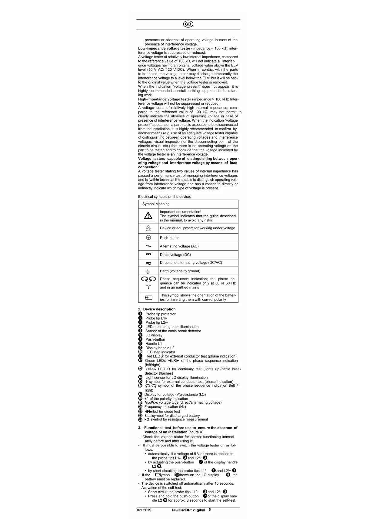 after using the voltage tester! - Please observe that the impedance (internal resistance) of the voltage tester influences the indication of interference voltages (capacitively or inductively induced)! Depending on the internal impedance of the voltage de- tector, there will be a different capability of indicating the02/ 2019 DUSPOL
