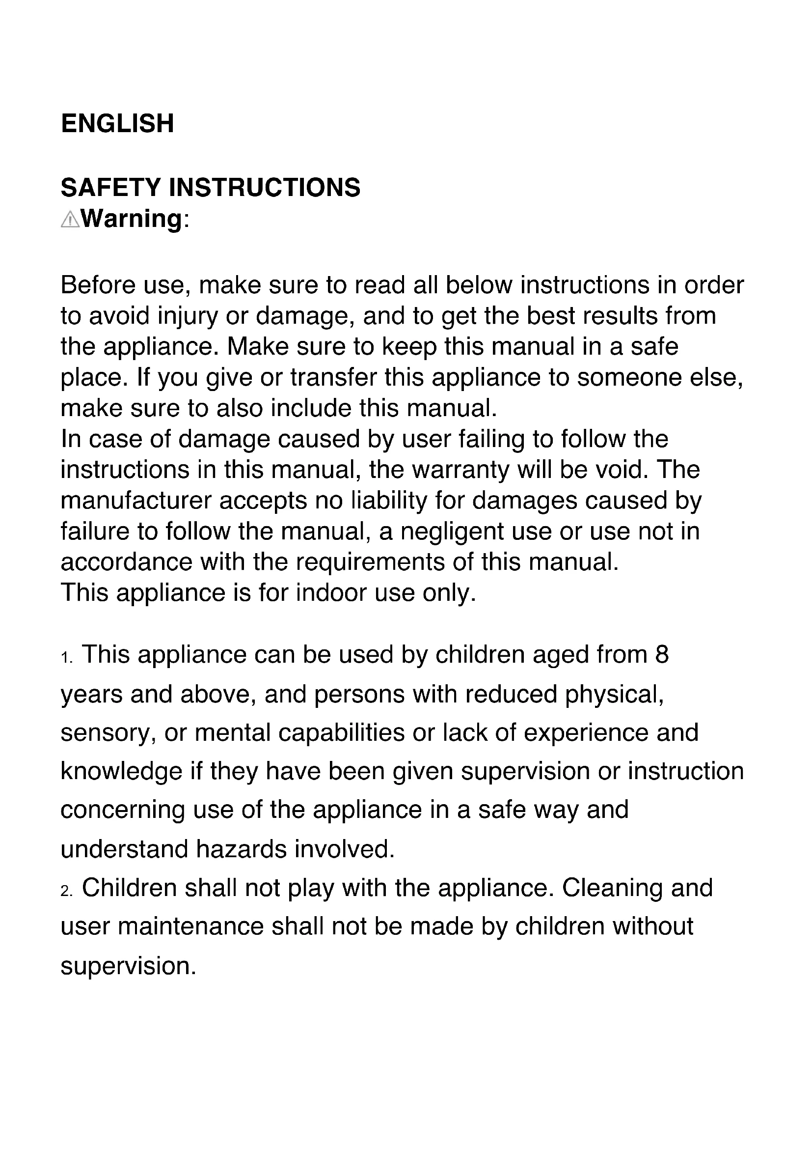 Before use, make sure to read all below instructions in order to avoid injury or damage, and to get the best results from the appliance. Make sure to keep this manual in a safe place. If you give or transfer this appliance to someone else, make sure to also include this manual. In case of damage caused by user failing to follow the instructions in this manual, the warranty will be void. The manufacturer accepts no liability for damages caused by failure to follow the manual, a negligent use or use not in accordance with the requirements of this manual. This appliance is for indoor use only.