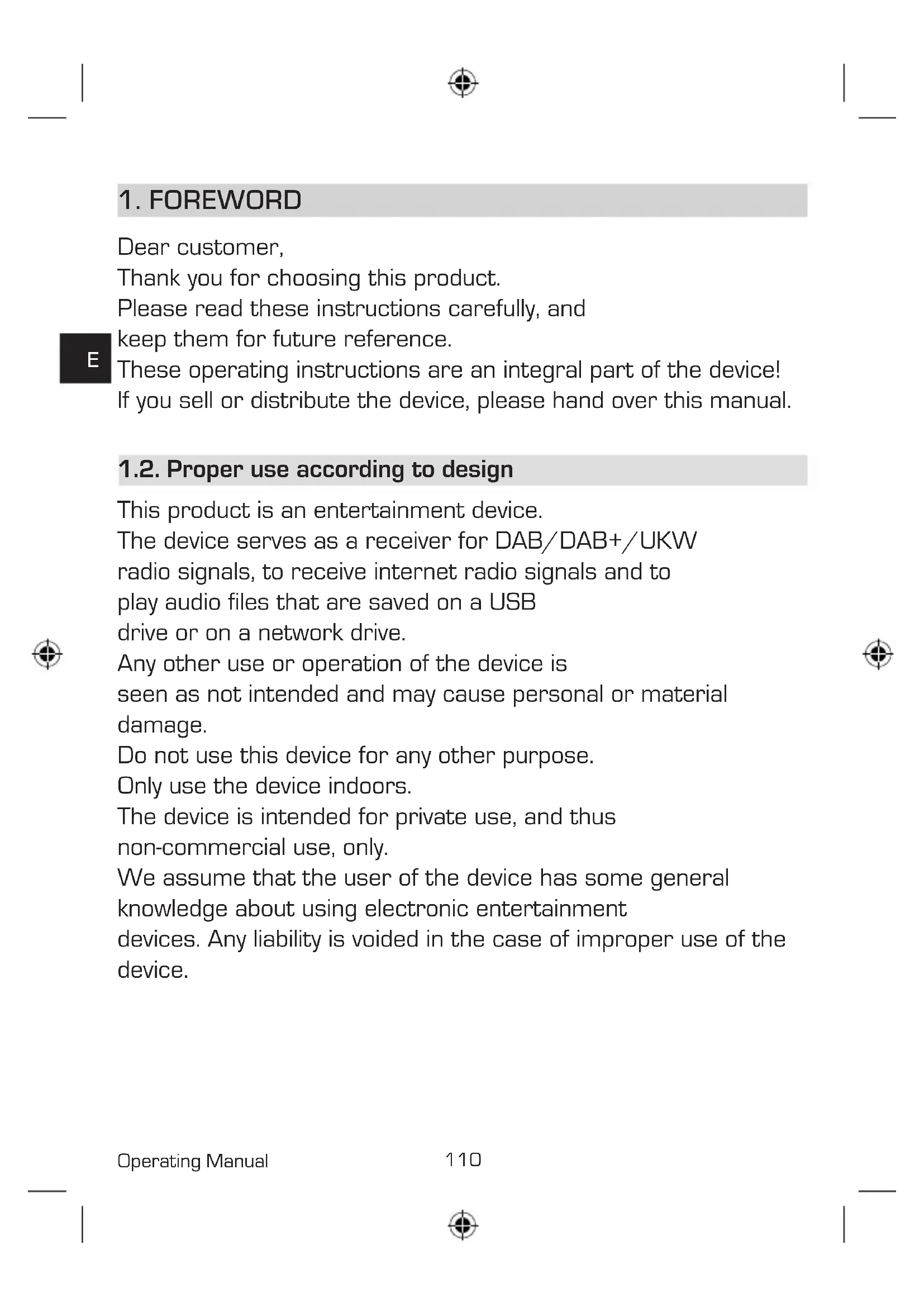Dear customer, Thank you for choosing this product. Please read these instructions carefully, and keep them for future reference. These operating instructions are an integral part of the device! If you sell or distribute the device, please hand over this manual. 1.2. Proper use according to design This product is an entertainment device. The device serves as a receiver for DAB/DAB+/UKW radio signals, to receive internet radio signals and to play audio files that are saved on a USB drive or on a network drive. Any other use or operation of the device is seen as not intended and may cause personal or material damage. Do not use this device for any other purpose. Only use the device indoors. The device is intended for private use, and thus non-commercial use, only. We assume that the user of the device has some general knowledge about using electronic entertainment devices. Any liability is voided in the case of improper use of the device.