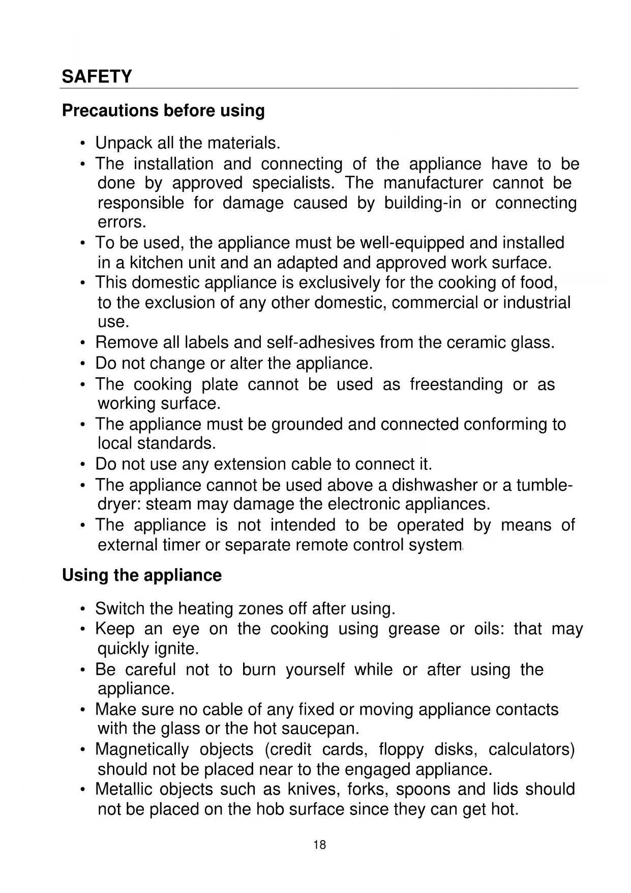 - Sugar, synthetic materials or aluminium sheets must not contact with the heating zones. These may cause breaks or other alterations of the vitroceramic glass by cooling: switch on the appliance and take them immediately out of the hot heating zone (be careful: do not burn yourself).