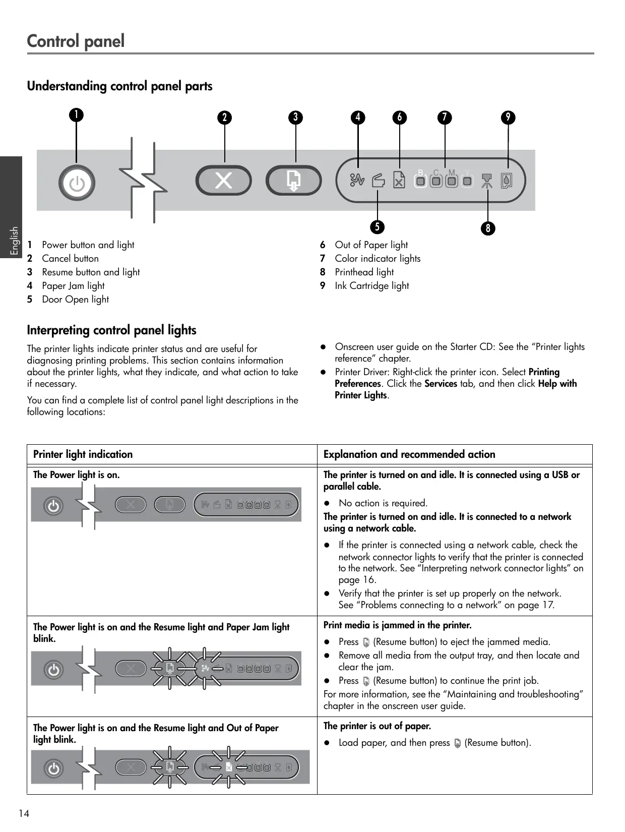 Interpreting control panel lights The printer lights indicate printer status and are useful for diagnosing printing problems. This section contains information about the printer lights, what they indicate, and what action to take if necessary. You can find a complete list of control panel light descriptions in the following locations: