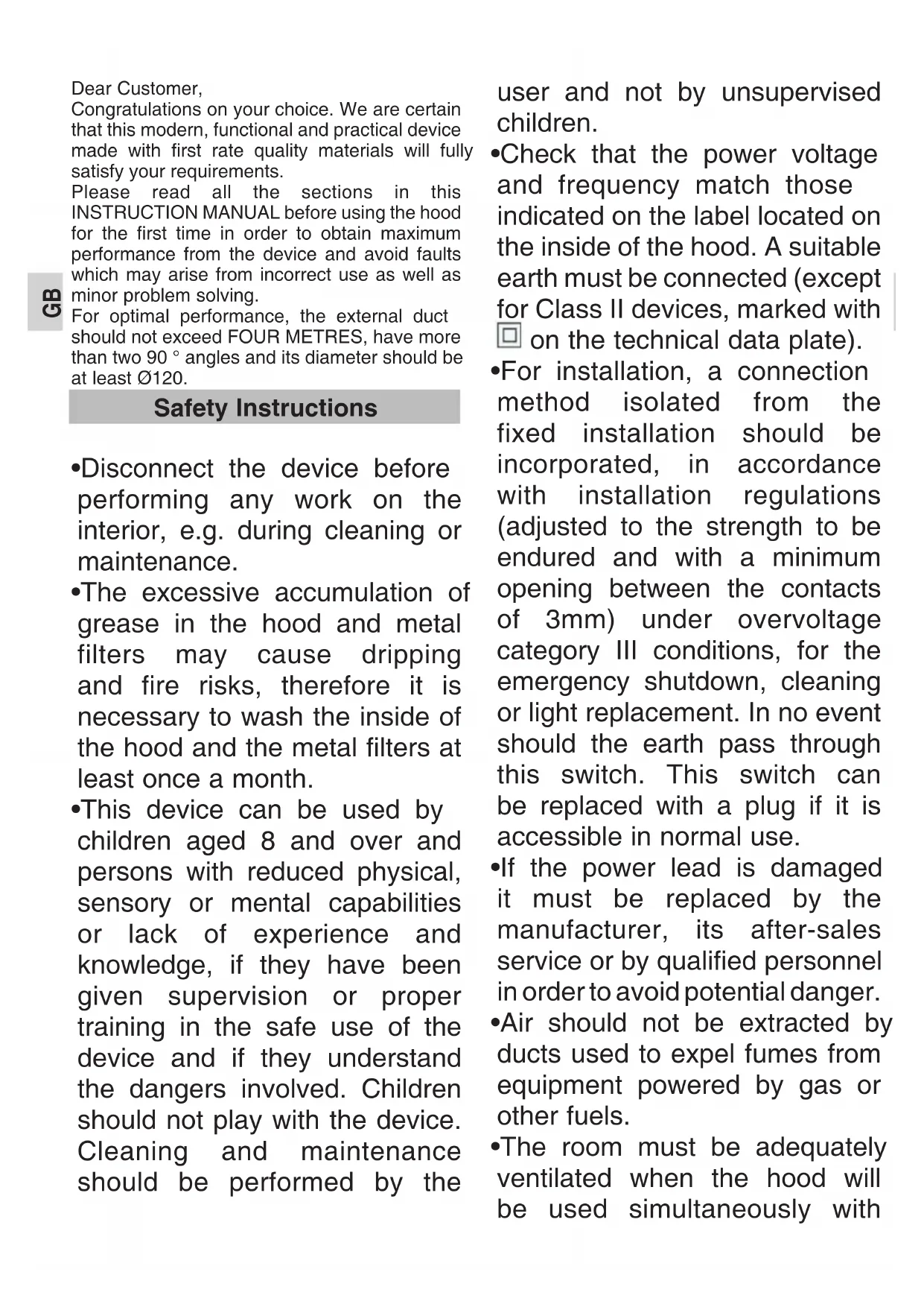 • The room must be adequately ventilated when the hood will be used simultaneously with Safety InstructionsGB equipment powered by energy other than electricity e.g. gas cookers.