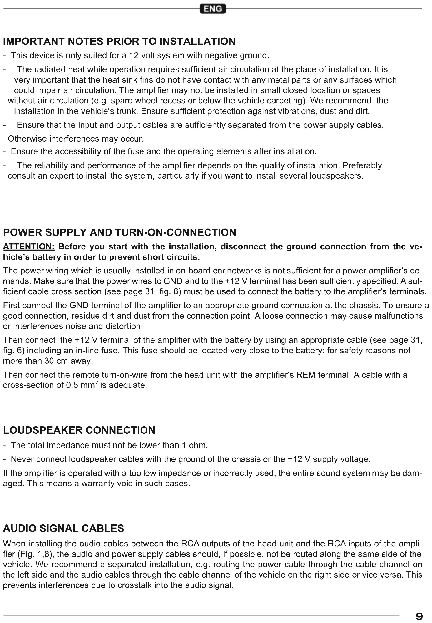 - This device is only suited for a 12 volt system with negative ground. - Theradiatedheatwhileoperationrequiressufcientaircirculationattheplaceofinstallation.Itis veryimportantthattheheatsinknsdonothavecontactwithanymetalpartsoranysurfaceswhich couldimpairaircirculation.Theampliermaynotbeinstalledinsmallclosedlocationorspaces without air circulation (e.g. spare wheel recess or below the vehicle carpeting). We recommend the installationinthevehicle’strunk.Ensuresufcientprotectionagainstvibrations,dustanddirt. - Ensurethattheinputandoutputcablesaresufcientlyseparatedfromthepowersupplycables. Otherwise interferences may occur. - Ensure the accessibility of the fuse and the operating elements after installation. - Thereliabilityandperformanceoftheamplierdependsonthequalityofinstallation.Preferably consult an expert to install the system, particularly if you want to install several loudspeakers.