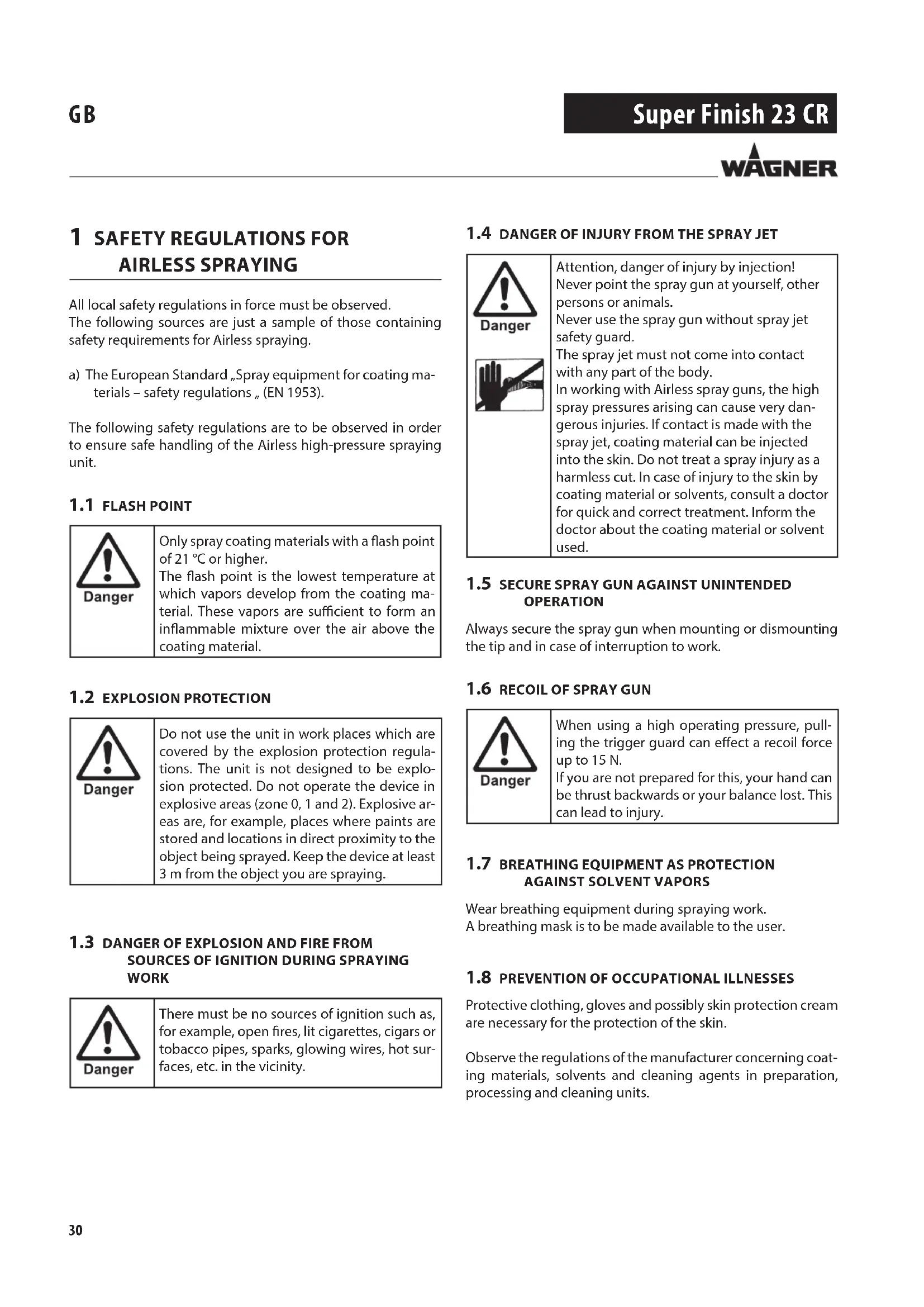 Never bring ngers, hands or other body parts into contact with the spray jet!Never point the spray gun at yourself, other persons or animals. Never use the spray gun without spray jet safety guard.Do not treat a spray injury as a harmless cut. In case of injury to the skin by coating material or solvents, consult a doctor for quick and correct treatment. Inform the doctor about the coating material or solvent used. The following points are to be observed in accordance with the operating manual before every start-up:1. Faulty units may not be used.2. Secure a Wagner spray gun with the securing lever at the trigger guard.3. Ensure earthing.4. Check the permissible operating pressure of the high-pressure hose and spray gun.5. Check all the connecting parts for leaks. Instructions for regular cleaning and maintenance of the unit are to be observed strictly.Observe the following rules before any work on the unit and at every working break:1. Relieve the pressure from the spray gun and high-pressure hose.2. Secure a Wagner spray gun with the securing lever at the trigger guard3. Switch the unit o. WARNING! Attention, danger of injury by injection! Airless units develop extremely high spray pressures. Ensure safety!29 Super Finish 23 CR CONTENTS Contents