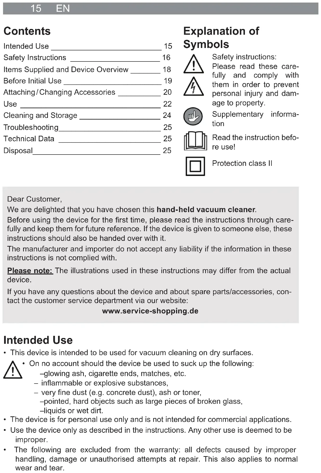 - The following are excluded from the warranty: all defects caused by improper handling, damage or unauthorised attempts at repair. This also applies to normal wear and tear. Explanation of Symbols Safety instructions: Please read these care- fully and comply with them in order to prevent personal injury and dam- age to property. Supplementary informa- tion Read the instruction befo- re use! Protection class II Dear Customer, We are delighted that you have chosen this hand-held vacuum cleaner. Before using the device for the fi rst time, please read the instructions through care- fully and keep them for future reference. If the device is given to someone else, these instructions should also be handed over with it. The manufacturer and importer do not accept any liability if the information in these instructions is not complied with. Please note: The illustrations used in these instructions may differ from the actual device. If you have any questions about the device and about spare parts/accessories, con- tact the customer service department via our website: www.service-shopping.de Contents Intended Use __________________________ 15 Safety Instructions _____________________ 16 Items Supplied and Device Overview _______ 18 Before Initial Use _______________________ 19 Attaching / Changing Accessories __________ 20 Use _________________________________ 22 Cleaning and Storage ___________________ 24 Tr oubles hootin g ________________________ 25 Technical Data ________________________ 25 Disposal______________________________ 25EN 16 Safety Instructions ■ This device may be used by children aged 8 and over and by people with reduced physical, sensory or mental abilities or a lack of experience and/or knowledge if they are supervised or have received instruction on how to use the device safely and have understood the dangers resulting from this. ■ Children must not play with the device. ■ Cleaning and user maintenance may not be performed by children, unless they are older than 8 years of age and are supervised. ■ Children younger than 8 years of age and animals must be kept away from the device and the connecting cable. ■ Children must be supervised to guarantee that they do not play with and/or injure themselves on the device. ■ The device should only be used and stored out of the reach of children and animals. Improper use can lead to injuries and electric shock. The mains cable must also be kept out of the reach of children and animals. ■ The device must always be disconnected from the mains power when it is left unattended and before assembling, disassembling or cleaning the device. ■ Only ever charge up the rechargeable battery using the adapter which is supplied with the device. Do not charge up any other devices using the charger which is supplied with the device. ■ Never immerse the device, mains cable or plug in water or other liquids and ensure that they cannot fall into water or become wet. ■ If the device, the connecting cable or the plug of the device is damaged, it must be replaced by the manufacturer or customer service department or a similarly qualifi ed person (e.g. specialist workshop) in order to avoid any hazards. Danger of Injury ■ Keep the device and packaging material away from children and animals. There is a risk of injury and suffocation! ■ The device should not be used if it is damaged. ■ Never hold the nozzles close to parts of your body or animals during use. They could become stuck to the device. Should the vacuum cleaner become stuck, switch the device off immediately using the On/Off switch.17 EN Danger of Electric Shock and Fire ■ The device should only be connected to a properly installed plug socket with safety contacts. The plug socket must also be readily accessible after connection so that the connection to the mains can quickly be isolated. The mains voltage must match the technical data of the device. Only use suitable extension cables whose technical data is the same as that of the device. ■ Should the device fall into water, switch off the power supply immediately. Do not at- tempt to pull the device out of the water while it is still connected to the mains power! ■ Never touch the device, mains cable or mains plug with wet hands when these components are connected to the mains power. ■ Switch the device off and pull the mains plug out of the socket – if you stop working with the device, – before a thunderstorm, – if a fault or error occurs while the device is in operation, – if foreign bodies have found their way into the device. ■ Always pull the mains plug and never the mains cable. ■ Use the device only in closed rooms. ■ Do not use the device in rooms containing easily ignitable dust or poisonous and explosive fumes. ■ Danger of fi re! Do not operate the device in a very damp environment or in the vicinity of combustible material. Avoiding Damage to Material, Property and the Device ■ Always lay the cable of the adapter in such a way that it does not present a trip hazard. ■ Make sure that the mains cable is not squashed, bent or laid over sharp edges and does not come into contact with hot surfaces. ■ Maintain a suffi cient distance from heat sources such as hobs or ovens in order not to damage the device. Do not place any naked fl ames, e.g. burning candles, in the immediate vicinity of the device, cable, rechargeable battery or adapter. ■ Do not drop the device or allow it to be knocked violently. ■ Do not pull or carry the device by the cable of the adapter. ■ Do not expose the device to extreme temperatures, wide temperature variations, moisture, wet conditions or direct sunlight. ■ Do not use any caustic or abrasive cleaning agents to clean the device. These can damage the surface. ■ The device should only be used when it is fully and correctly assembled. The dust container and the fi lters must be inserted. The fi lters must not be damaged! ■ Do not insert anything into