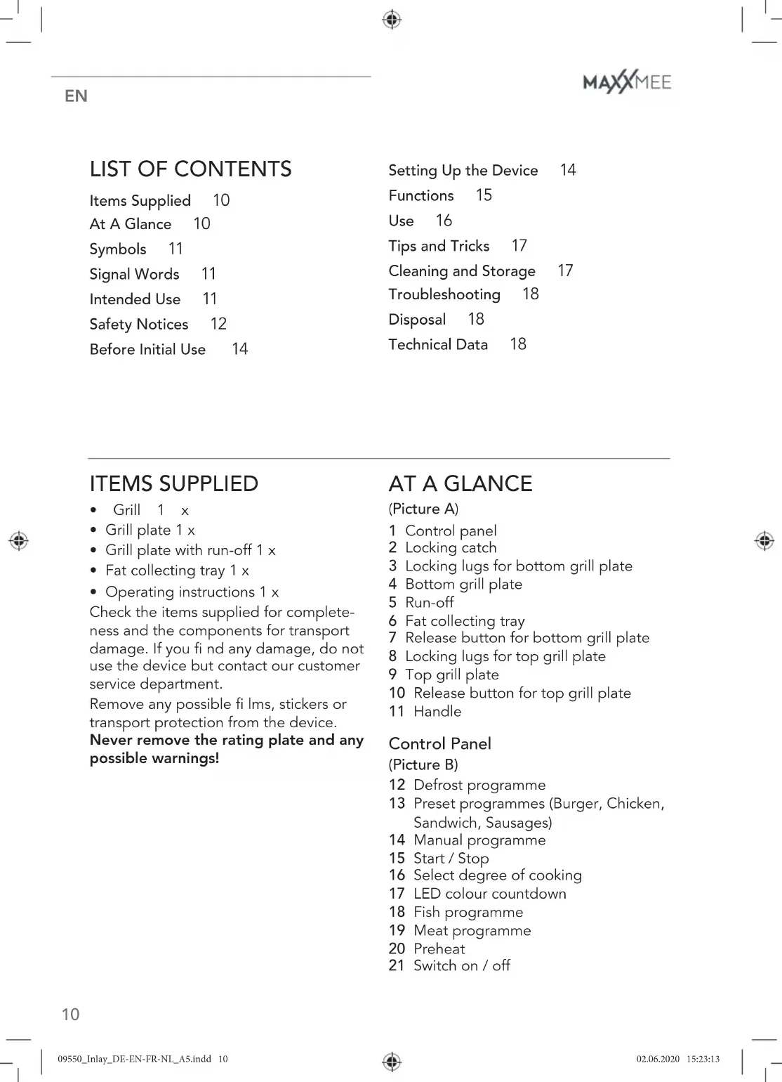 Circuit symbol for alternating current Caution: Hot surfaces! Suitable for use with food. SIGNAL WORDS DANGER warns of serious injuries and danger to life WARNING warns of possible serious injuries and danger to life CAUTION warns of slight to moder- ate injuries NOTICE warns of material damage INTENDED USE ■ The device is intended to be used for frying and grilling food. ■ The device is for personal use only and is not intended for commercial or domestic-like applications, e.g. in hotels, bed and breakfasts, offi ces, staff kitchens or similar places. ■ Use the device only for the specifi ed purpose and as described in the operating instructions. Any other use is deemed to be improper. ■ The warranty does not cover faults caused by incorrect handling, damage or attempted repairs. The same ap- plies to normal wear and tear. Dear Customer, We are delighted that you have chosen the MAXXMEE digital contact grill. It allows you to prepare fi sh, steaks, sandwiches, burgers, sausages and poultry just like a pro- fessional. Simply select one of the grill programmes, place the food to be cooked on the grill, fl ip it shut and wait. The LED colour countdown indicates to you when your grilled food is ready to be eaten. If you have any questions about the device and about spare parts/accessories, contact the customer service department via our website: www.dspro.de/kundenservice We hope you have a lot of fun with your MAXXMEE digital contact grill. Information About the Operating Instructions Before using the device for the fi rst time, please read through these operating in- structions carefully and keep them for future reference and other users. They form an integral part of the device. The manufacturer and importer do not accept any liability if the information in these operating instructions is not complied with. 09550_Inlay_DE-EN-FR-NL_A5.indd 1109550_Inlay_DE-EN-FR-NL_A5.indd 11 02.06.2020 15:23:1302.06.2020 15:23:13EN