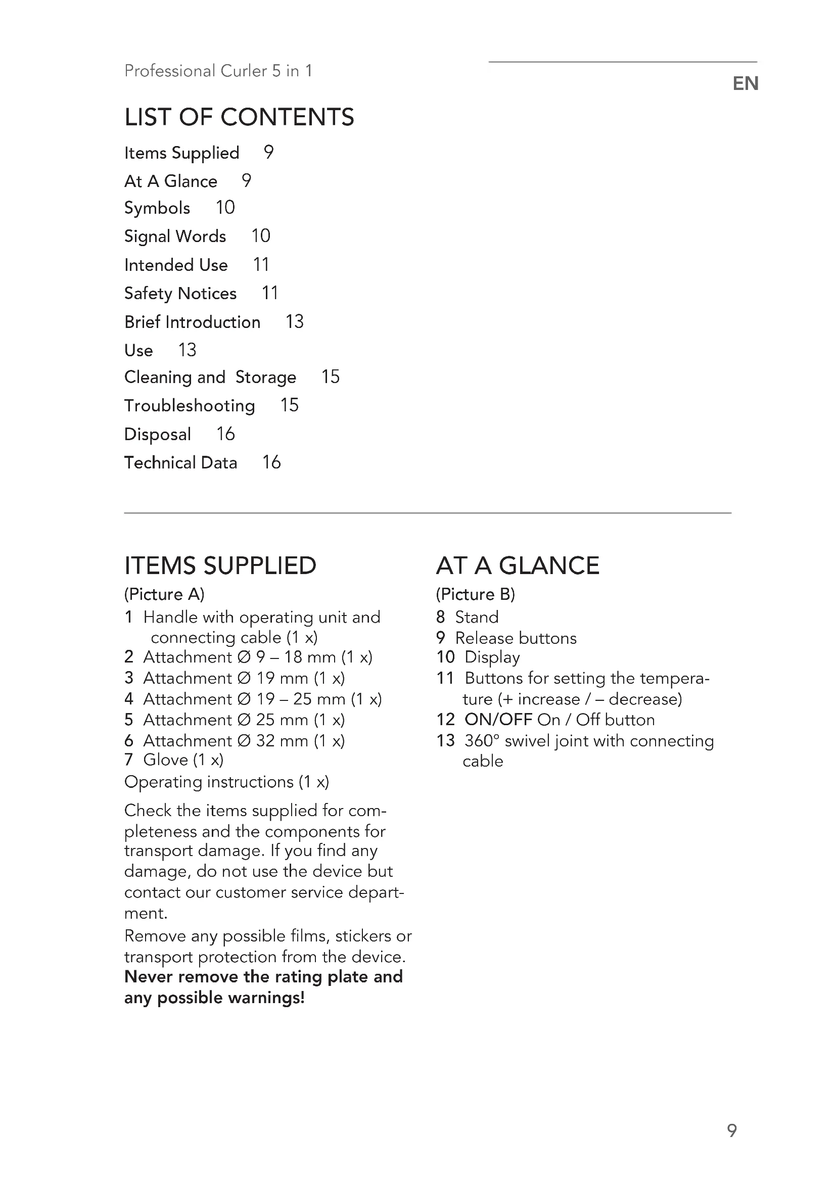 DANGER – Danger of Electric Shock ■ Use and store the device only in closed rooms. ■ Do not operate or store the de- vice in rooms with high humidity. ■ Never immerse the device and the connecting cable in water or other liquids and ensure that they cannot fall into water or become wet. ■ If the device falls into water while it is connected to the mains power, do not touch the device, but pull the mains adapter out of the plug socket immediately! Only after this should you retrieve the device from the water. ■ Never touch the device and the connecting cable with wet hands when the device is connected to the mains power. ■ Do not use the device if it has malfunctioned, fallen into water or if there is visible damage on the device, accessory or on the connecting cable. Have it checked in a specialist workshop before using it again. WARNING – Danger of Fire ■ Keep the device away from com- bustible materials and substances. ■ Do not cover the device during operation! ■ Unwind the connecting cable fully before connecting up the device. WARNING – Danger of Injury ■ Keep children and animals away from the packaging material. There is a danger of suffocation. ■ Make sure that the connecting ca- ble is always kept out of the reach of small children and animals. There is a danger of strangulation. ■ Make sure that the connecting ca- ble does not present a trip hazard. CAUTION: The attachment will get hot during use! Be careful handling the device, only ever hold it firmly by the handle. There is a danger of burns! NOTICE – Risk of Damage to Material and Property ■ Use and store the device at room temperature. Protect the device from: fire and heat sources, ex- treme temperatures, temperature fluctuations or prolonged direct sunlight. ■ Do not place heavy objects on the device, its connecting cable or the accessories. Protect the device from impacts. ■ Only connect the device to a plug socket that is properly installed. The plug socket must also be readily accessible after connec- tion so that the connection to the mains can quickly be isolated. The mains voltage must match the data on the rating plate of the device. ■ Lay the connecting cable so that it is not squashed, bent or laid over sharp edges and does not come into contact with hot surfaces. ■ Pull the mains plug out of the plug socket before a thunderstorm. ■ In the event of damage / faults, switch the device off immediately / disconnect it from the mains power. ■ When you disconnect it from the mains power, always pull on the mains plug and never the mains cable. ■ Do not pull or carry the device by the connecting cable.Professional Curler 5 in 1