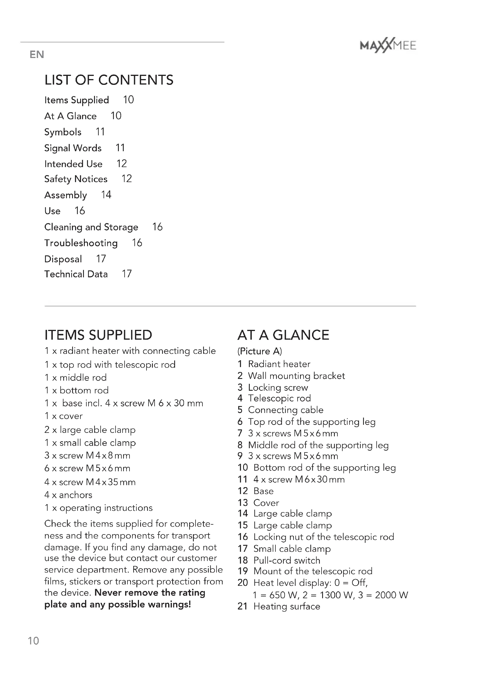 Items Supplied 10 At A Glance 10 Symbols 11 Signal Words 11 Intended Use 12 Safety Notices 12 Assembly 14 Use 16 Cleaning and Storage 16 Troubleshooting 16 Disposal 17 Technical Data 17 ITEMS SUPPLIED 1 x radiant heater with connecting cable 1 x top rod with telescopic rod 1 x middle rod 1 x bottom rod 1 x base incl. 4 x screw M 6 x 30 mm 1 x cover 2 x large cable clamp 1 x small cable clamp 3 x screw M 4 x 8 mm 6 x screw M 5 x 6 mm 4 x screw M 4 x 35 mm 4 x anchors 1 x operating instructions Check the items supplied for complete- ness and the components for transport damage. If you find any damage, do not use the device but contact our customer service department. Remove any possible films, stickers or transport protection from the device. Never remove the rating plate and any possible warnings!