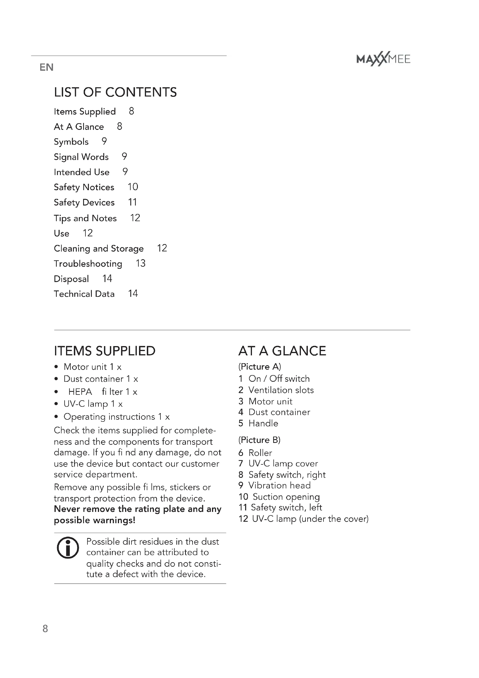 Protection class II SIGNAL WORDS Signal words indicate hazards if the asso- ciated notices are not followed. DANGER – high risk, results in serious injury or death WARNING – medium risk, may result in serious injury or death CAUTION – low risk, may result in minor or moderate injury NOTICE – may result in risk of damage to material INTENDED USE ■ This device is intended to be used to kill off bacteria and remove dust, germs and domestic dust mites. It is suitable for use on mattresses, bed sheets, bed covers, upholstered furniture and similar items. On no account should the device be used to suck up the following: ○ liquids or wet substances (e.g. wet carpet shampoo) ○ glowing ash, cigarette ends, matches, etc. ○ infl ammable or explosive substances ○ very fi ne dust (e.g. concrete dust), ash or toner ○ pointed, hard objects such as large pieces of broken glass ■ The device is for personal use only and is not intended for commercial applications. ■ The device should only be used as described in the operating instruc- tions. Any other use is deemed to be improper. ■ The warranty does not cover faults caused by incorrect handling, dama- ge, assembly or attempted repairs. The same applies to normal wear and tear. Dear Customer, We are delighted that you have chosen the MAXXMEE dust mite vacuum cleaner. It not only removes dust and dirt from mattresses, pillows, blankets and upholstered furniture, but at the same time sterilises the surfaces using UV-C light.If you have any questions about the device and about spare parts / accessories, contact the custo- mer service department via our website: www.dspro.de/kundenservice We hope you have a lot of fun with your MAXXMEE dust mite vacuum cleaner. Information About the Operating Instructions Before using the device for the fi rst time, please read through these operating inst- ructions carefully and keep them for future reference and other users. They form an integral part of the device. The manufacturer and importer do not accept any liability if the information in these operating instructions is not complied with.EN