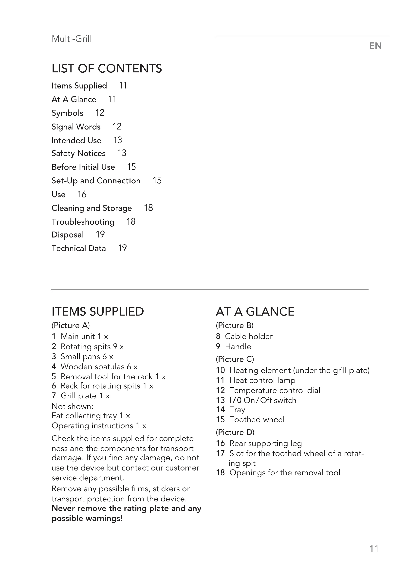 Items Supplied 11 At A Glance 11 Symbols 12 Signal Words 12 Intended Use 13 Safety Notices 13 Before Initial Use 15 Set-Up and Connection 15 Use 16 Cleaning and Storage 18 Troubleshooting 18 Disposal 19 Technical Data 19 ITEMS SUPPLIED (Picture A) 1 Main unit 1 x 2 Rotating spits 9 x 3 Small pans 6 x 4 Wooden spatulas 6 x 5 Removal tool for the rack 1 x 6 Rack for rotating spits 1 x 7 Grill plate 1 x Not shown: Fat collecting tray 1 x Operating instructions 1 x Check the items supplied for complete- ness and the components for transport damage. If you find any damage, do not use the device but contact our customer service department. Remove any possible films, stickers or transport protection from the device. Never remove the rating plate and any possible warnings!