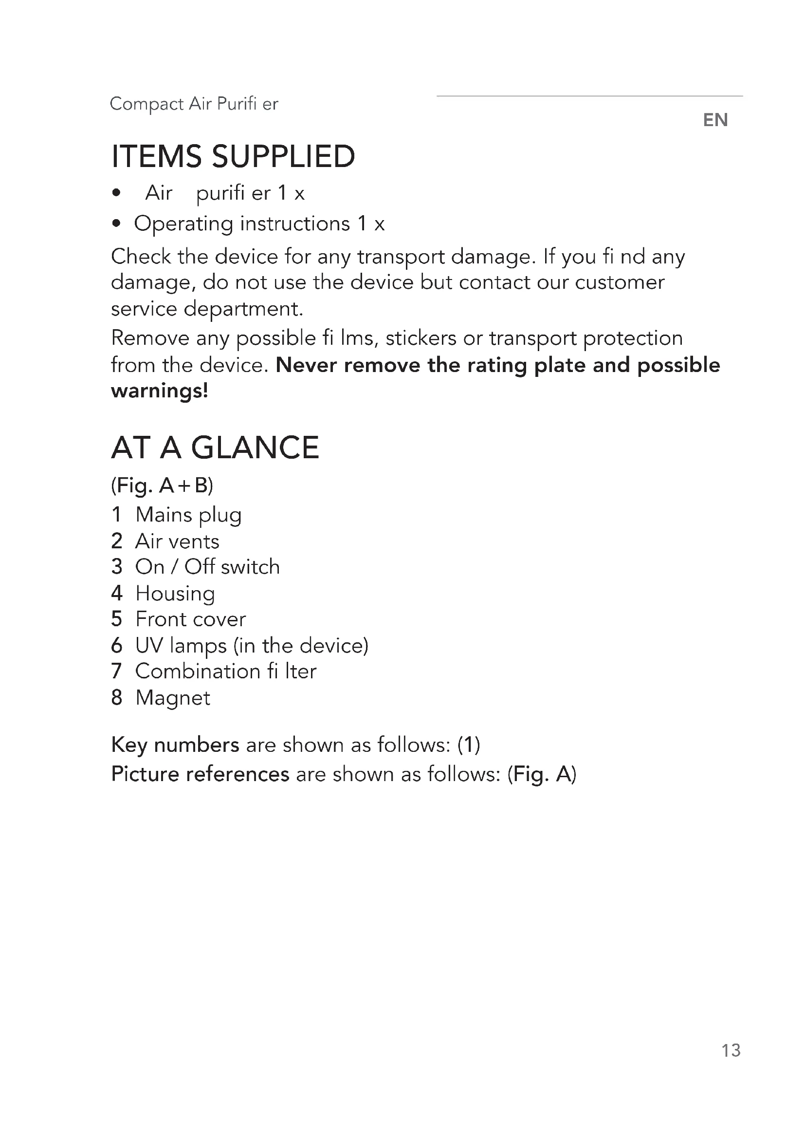 Remove any possible fi lms, stickers or transport protection from the device. Never remove the rating plate and possible warnings!