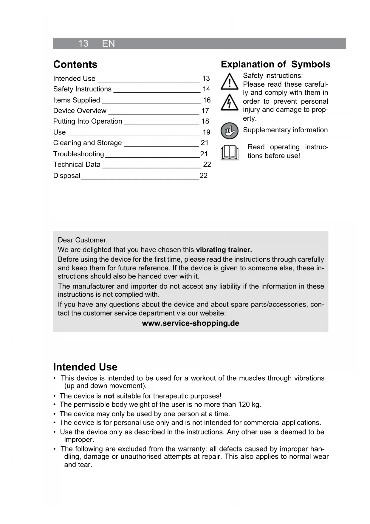 - The following are excluded from the warranty: all defects caused by improper han- dling, damage or unauthorised attempts at repair. This also applies to normal wear and tear. Explanation of Symbols Safety instructions: Please read these careful- ly and comply with them in order to prevent personal injury and damage to prop- erty. Supplementary information Read operating instruc- tions before use! Dear Customer, We are delighted that you have chosen this vibrating trainer. Before using the device for the fi rst time, please read the instructions through carefully and keep them for future reference. If the device is given to someone else, these in- structions should also be handed over with it. The manufacturer and importer do not accept any liability if the information in these instructions is not complied with. If you have any questions about the device and about spare parts/accessories, con- tact the customer service department via our website: www.service-shopping.de Contents Intended Use __________________________ 13 Safety Instructions ______________________ 14 Items Supplied _________________________ 16 Device Overview _______________________ 17 Putting Into Operation ___________________ 18 Use _________________________________ 19 Cleaning and Storage ___________________ 21 Troubleshooting ________________________ 21 Technical Data _________________________ 22 Disposal ______________________________ 22EN 14 Safety Instructions ■ This device may be used by children aged 8 and over and by people with reduced physical, sensory or mental abilities or a lack of experience and/or knowledge if they are supervised or have received instruction on how to use the device safely and understand the dangers resulting from this. ■ Children must not play with the device. ■ Cleaning and user maintenance may not be carried out by chil- dren without supervision. ■ Children younger than 8 years of age and animals must be kept away from the device and the mains cable. ■ The device must always be disconnected from the mains power when it is left unattended and before assembling, disassem- bling or cleaning the device. ■ If the connecting cable to the mains for this device is damaged, it must be replaced with a special connecting cable which is available from the manufacturer or its customer service depart- ment. ■ Do not make any changes to the device. If the device is dam- aged, it must be replaced by the manufacturer or customer ser- vice department or a similarly qualifi ed person (e.g. specialist workshop) in order to avoid any hazards. Dangers of Injury ■ Keep children and animals away from the packaging fi lm. There is a danger of suf- focation! ■ Make sure that the connected mains cable does not present a trip hazard. ■ Please consult your doctor before using the device if you belong to a health risk group, if you have not done any sport for some time, if you have balance problems, cardiovascular problems or orthopaedic problems. If necessary, coordinate your training programme with him. ■ Do not use the device if you have recently fractured a bone or have operation scars that have not yet healed. ■ Do not use the device if you have vein infl ammation, thromboses, swellings or acute infl ammation. Ask your doctor whether it is safe for you to use the device. ■ Pregnant women should not use the device or should use it only after consultation with their doctor. ■ Start on the slowest vibration level and increase the intensity only gradually. We ex- plicitly point out that improper use of the device and excessive use can be detrimental to your health.15 EN ■ CAUTION! Stop using the device immediately if you suddenly feel weak or dizzy. If you feel sick, have pain in your chest or arms, an irregular heartbeat, shortness of breath or other unusual symptoms, seek medical attention immediately. ■ Each time before you start using the device, make sure that there is suffi cient clear- ance around the device so that you cannot bump into walls, furniture, etc. during use. ■ The device may only be used by one person at a time. Danger of Electric Shock and Fire ■ Keep the device, the mains connecting cable and the remote control away from water or other liquids in order to avoid electric shocks. Never touch these parts with wet or damp hands. Should the device fall into water, switch off the power supply immedi- ately. Do not try to retrieve the device which is connected to the mains power from the water! ■ Use and store the device only in closed rooms. Do not operate it outdoors, in rooms with high humidity or on hot surfaces. ■ Do not use the device if highly fl ammable gases are present in the air. Never operate the device in the vicinity of a gas source. ■ Only ever place the device on a dry, even and fi rm surface. If you use the device on a carpet, make sure that the ventilation openings on the bottom of the device remain clear. ■ Make sure that the mains cable is not squashed, bent or laid over sharp edges and does not come into contact with hot surfaces. ■ Only ever connect the mains cable to a properly installed plug socket. The plug sock- et must also be readily accessible after connection. The mains voltage must match the technical data on the rating plate of the device. Only use suitable extension ca- bles whose technical data is the same as that of the device. ■ Switch off the device and pull the mains plug out of the plug socket if an error occurs during operation or before a thunderstorm. ■ When you want to remove the mains adapter from the socket, always pull the plug and not the cable. ■ The device must be switched off when you connect the mains cable or remove the mains cable. Danger from Batteries ■ Batteries can be deadly if swallowed. Therefore keep batteries and the remote con- trol out of the reach of small children. If a battery is swallowed, seek medical assis- tance immediately. ■ Before inserting the batteries, check whether th