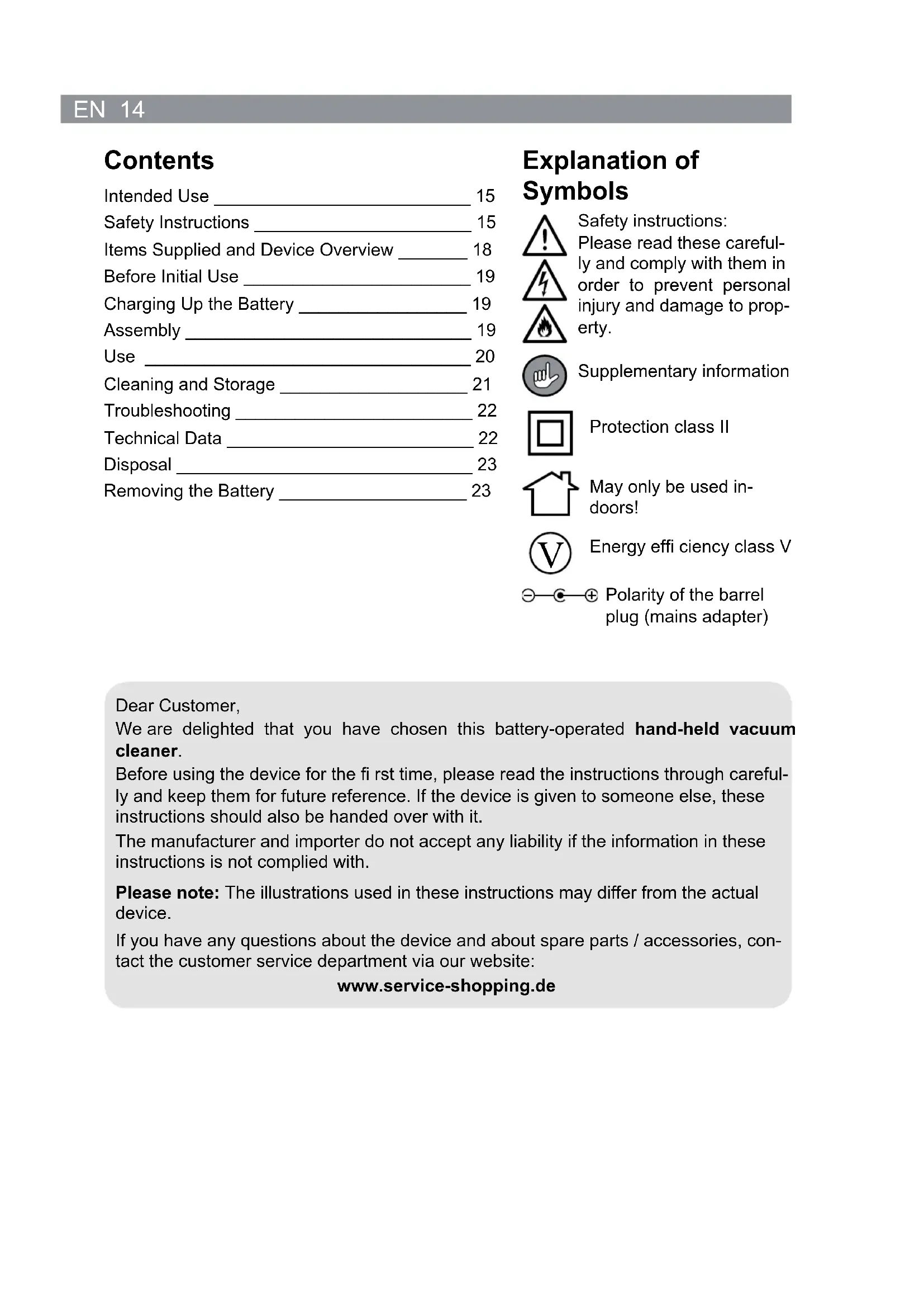 Dear Customer, We are delighted that you have chosen this battery-operated hand-held vacuum cleaner. Before using the device for the fi rst time, please read the instructions through careful- ly and keep them for future reference. If the device is given to someone else, these instructions should also be handed over with it. The manufacturer and importer do not accept any liability if the information in these instructions is not complied with. Please note: The illustrations used in these instructions may differ from the actual device. If you have any questions about the device and about spare parts / accessories, con- tact the customer service department via our website: www.service-shopping.de15 EN Intended Use