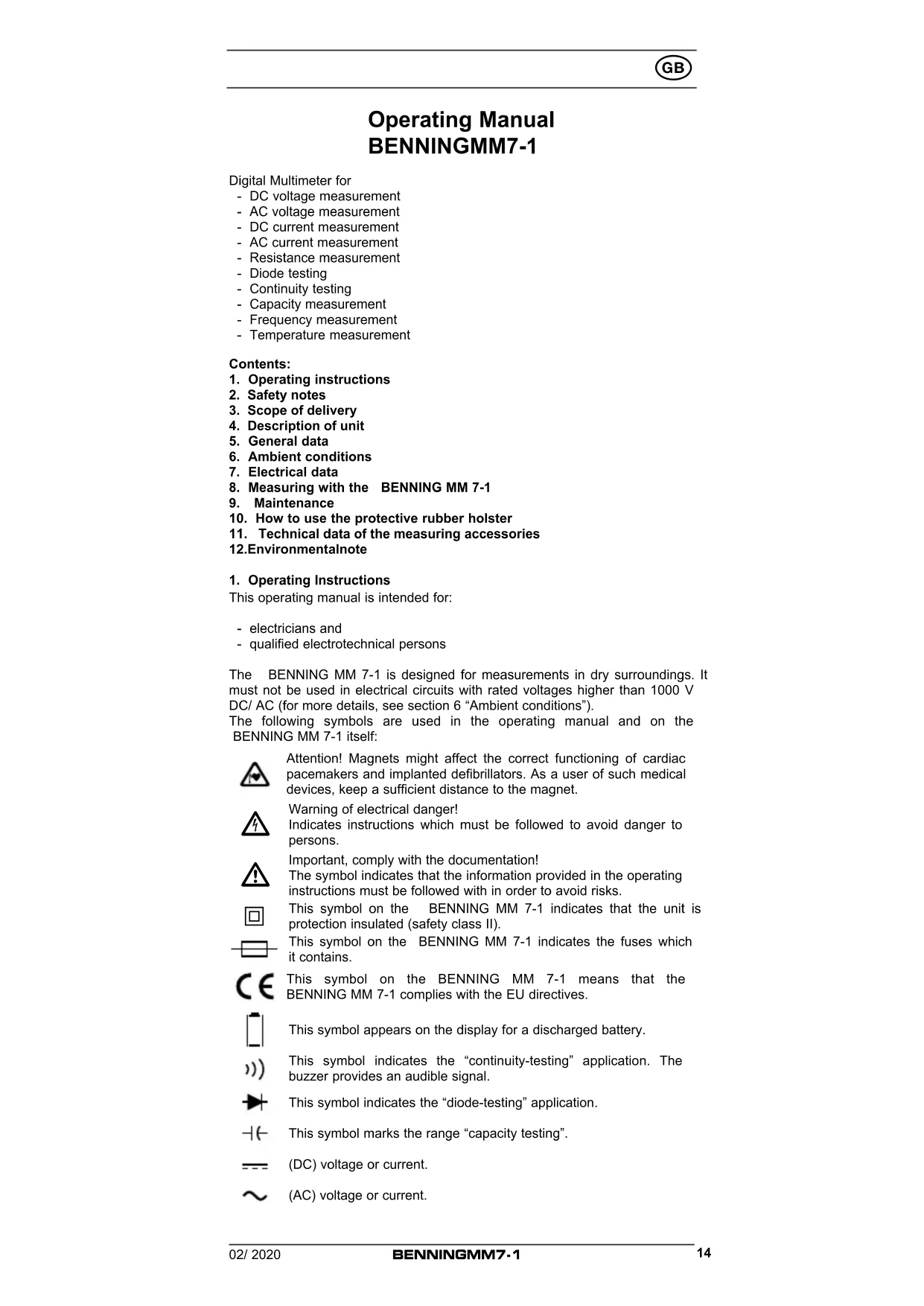 Download the instructions for your Multimeter in PDF format for free! Find your manual MM 71 - BENNING and take your electronic device back in hand. On this page are published all the documents necessary for the use of your device. MM 71 by BENNING.