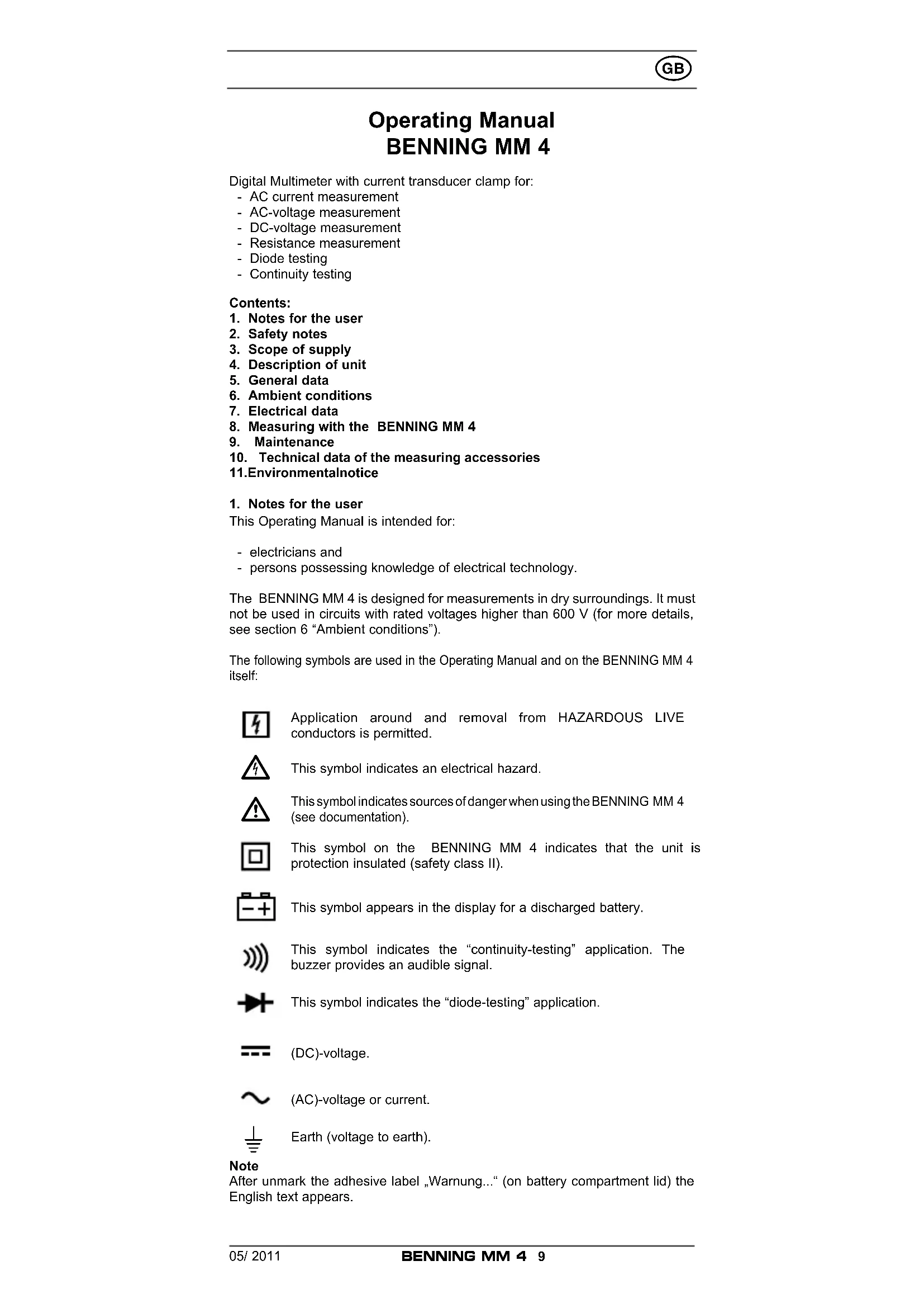 This Operating Manual is intended for: - electricians and - persons possessing knowledge of electrical technology. The BENNING MM 4 is designed for measurements in dry surroundings. It must not be used in circuits with rated voltages higher than 600 V (for more details, see section 6 “Ambient conditions”). The following symbols are used in the Operating Manual and on the BENNING MM 4 itself: Application around and removal from HAZARDOUS LIVE conductors is permitted.