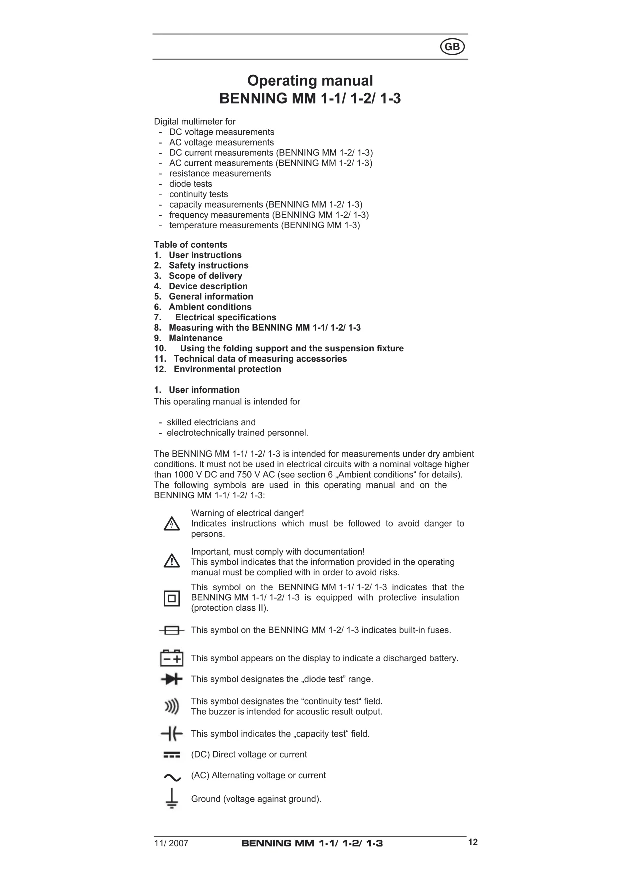 This operating manual is intended for - skilled electricians and - electrotechnically trained personnel. The BENNING MM 1-1/ 1-2/ 1-3 is intended for measurements under dry ambient conditions. It must not be used in electrical circuits with a nominal voltage higher than 1000 V DC and 750 V AC (see section 6 „Ambient conditions“ for details). The following symbols are used in this operating manual and on the BENNING MM 1-1/ 1-2/ 1-3:
