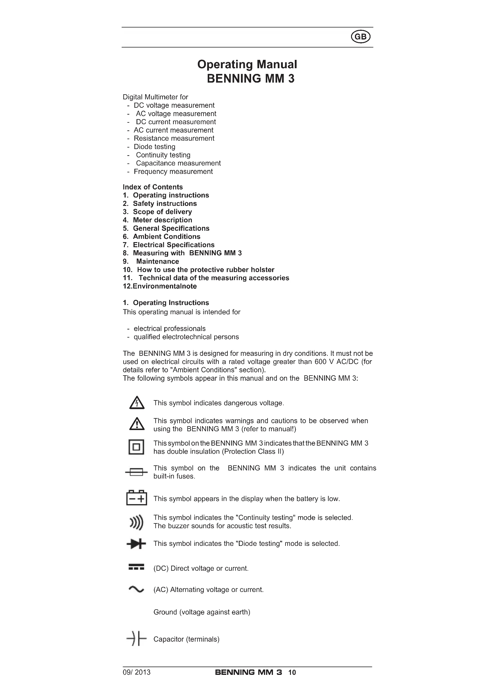 Operating Manual BENNING MM 3 Digital Multimeter for - DC voltage measurement - AC voltage measurement - DC current measurement - AC current measurement - Resistance measurement - Diode testing - Continuity testing - Capacitance measurement - Frequency measurement Index of Contents