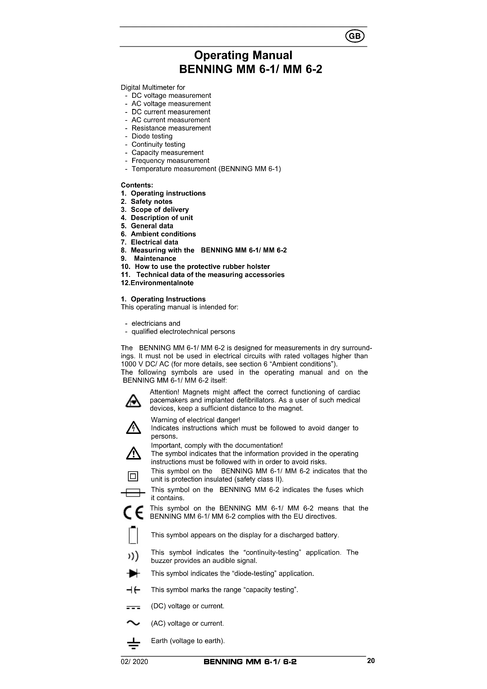 This operating manual is intended for: - electricians and - qualified electrotechnical persons The BENNING MM 6-1/ MM 6-2 is designed for measurements in dry surround- ings. It must not be used in electrical circuits with rated voltages higher than 1000 V DC/ AC (for more details, see section 6 “Ambient conditions”). The following symbols are used in the operating manual and on the BENNING MM 6-1/ MM 6-2 itself: Attention! Magnets might affect the correct functioning of cardiac pacemakers and implanted defibrillators. As a user of such medical devices, keep a sufficient distance to the magnet.