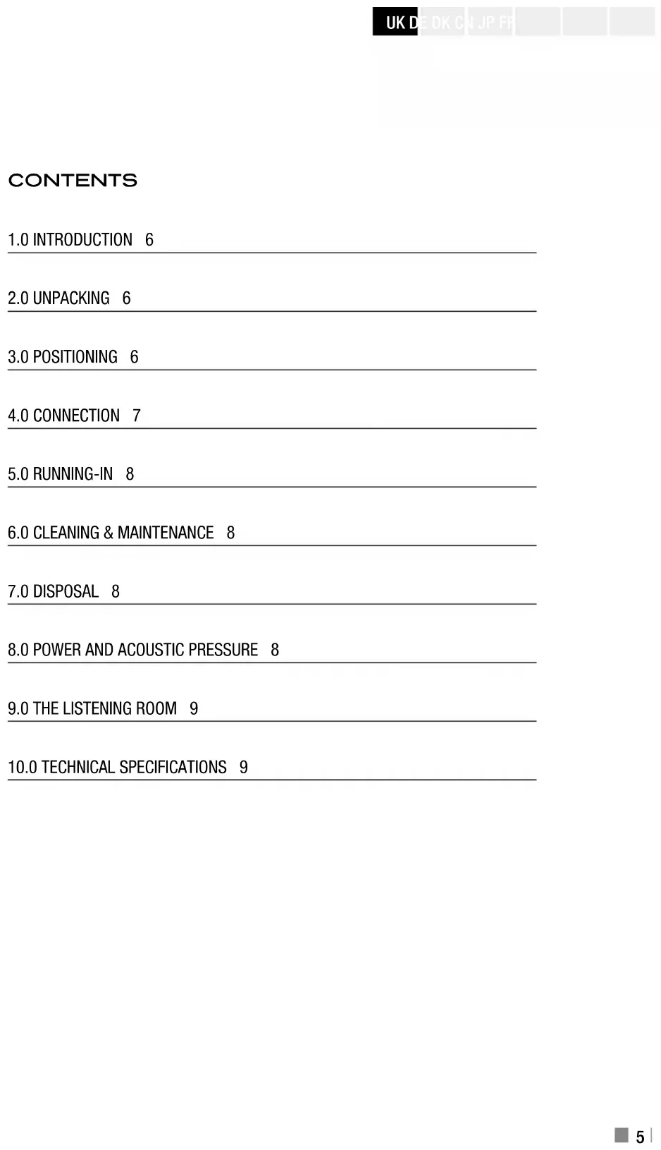 Both speakers are designed as floor standing speakers and they should ideally be positioned minimum 20 cm (8”) from the rear wall. They both can be used with spikes or rubber bumpers under the speakers (see Figure 4D/E). Be careful not to over tighten the spike locking nuts.7 UK DE DK CN JP FR Spikes or rubber bumpers can improve the sound quality. You can try both to hear what gives the best sound quality in your setup. Please be aware, that spikes may damage the floor, if it is not protected by e.g. coins under the spikes.
