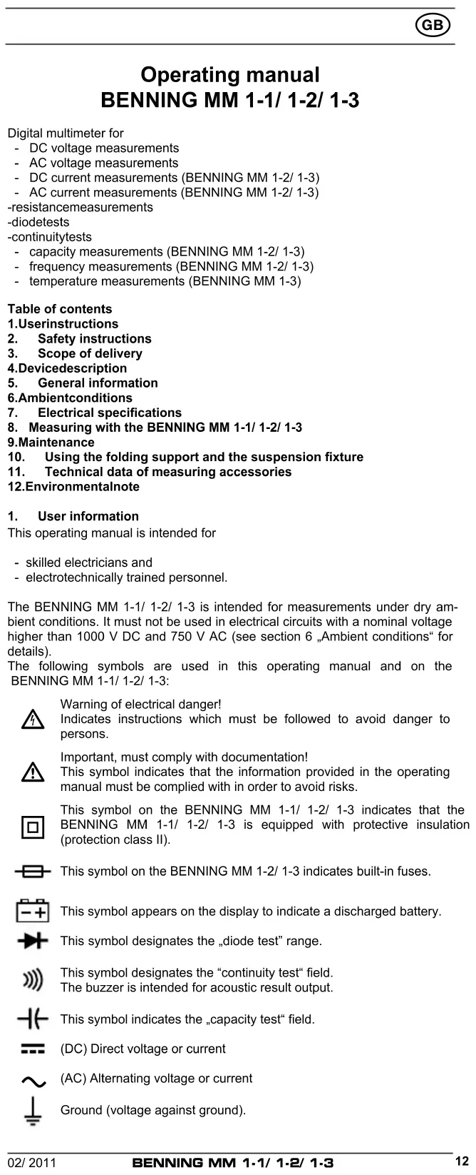 This operating manual is intended for - skilled electricians and - electrotechnically trained personnel. The BENNING MM 1-1/ 1-2/ 1-3 is intended for measurements under dry am- bient conditions. It must not be used in electrical circuits with a nominal voltage higher than 1000 V DC and 750 V AC (see section 6 „Ambient conditions“ for details). The following symbols are used in this operating manual and on the BENNING MM 1-1/ 1-2/ 1-3: