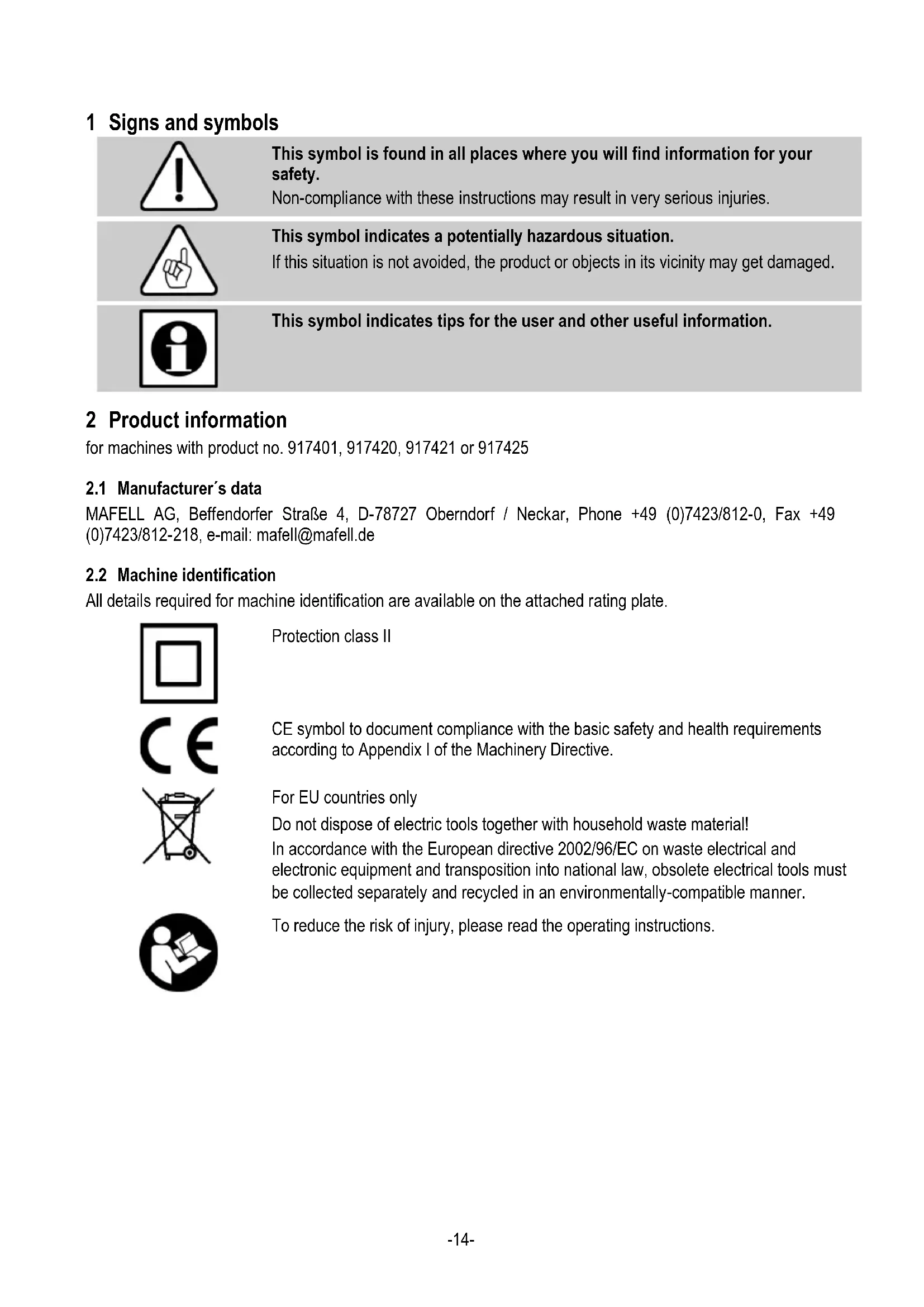 This symbol indicates tips for the user and other useful information. 2 Product information for machines with product no. 917401, 917420, 917421 or 917425