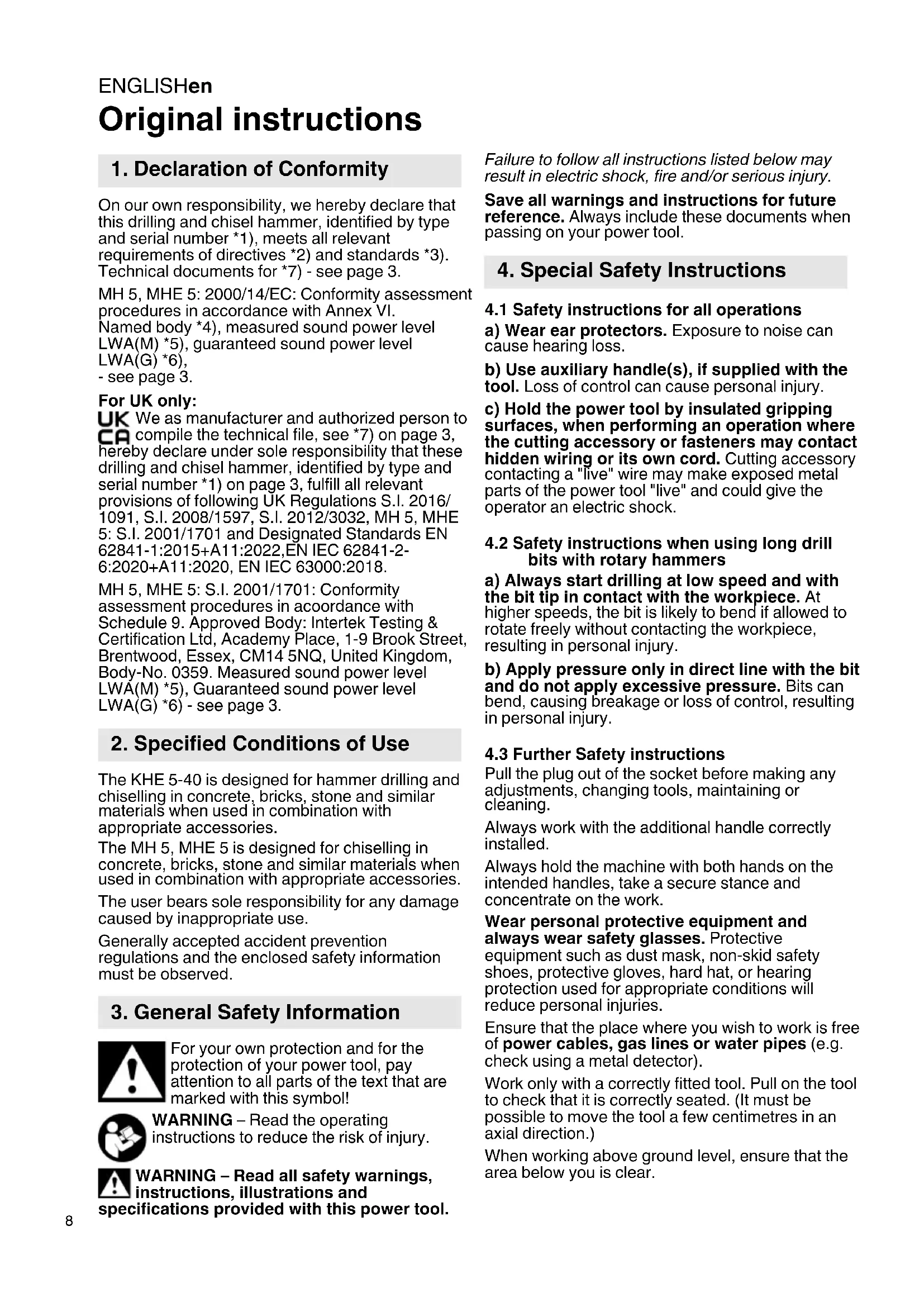 UK We as manufacturer and authorized person to compile the technical file, see *7) on page 3, hereby declare under sole responsibility that these drilling and chisel hammer, identified by type and serial number *1) on page 3, fulfill all relevant provisions of following UK Regulations S.I. 2016/ 1091,S.I.2008/1597,S.I.2012/3032,MH 5,MHE 5:S.I.2001/1701 and Designated Standards EN 62841-1:2015+A11:2022,EN IEC 62841-2- 6:2020+A11:2020,EN IEC 63000:2018.