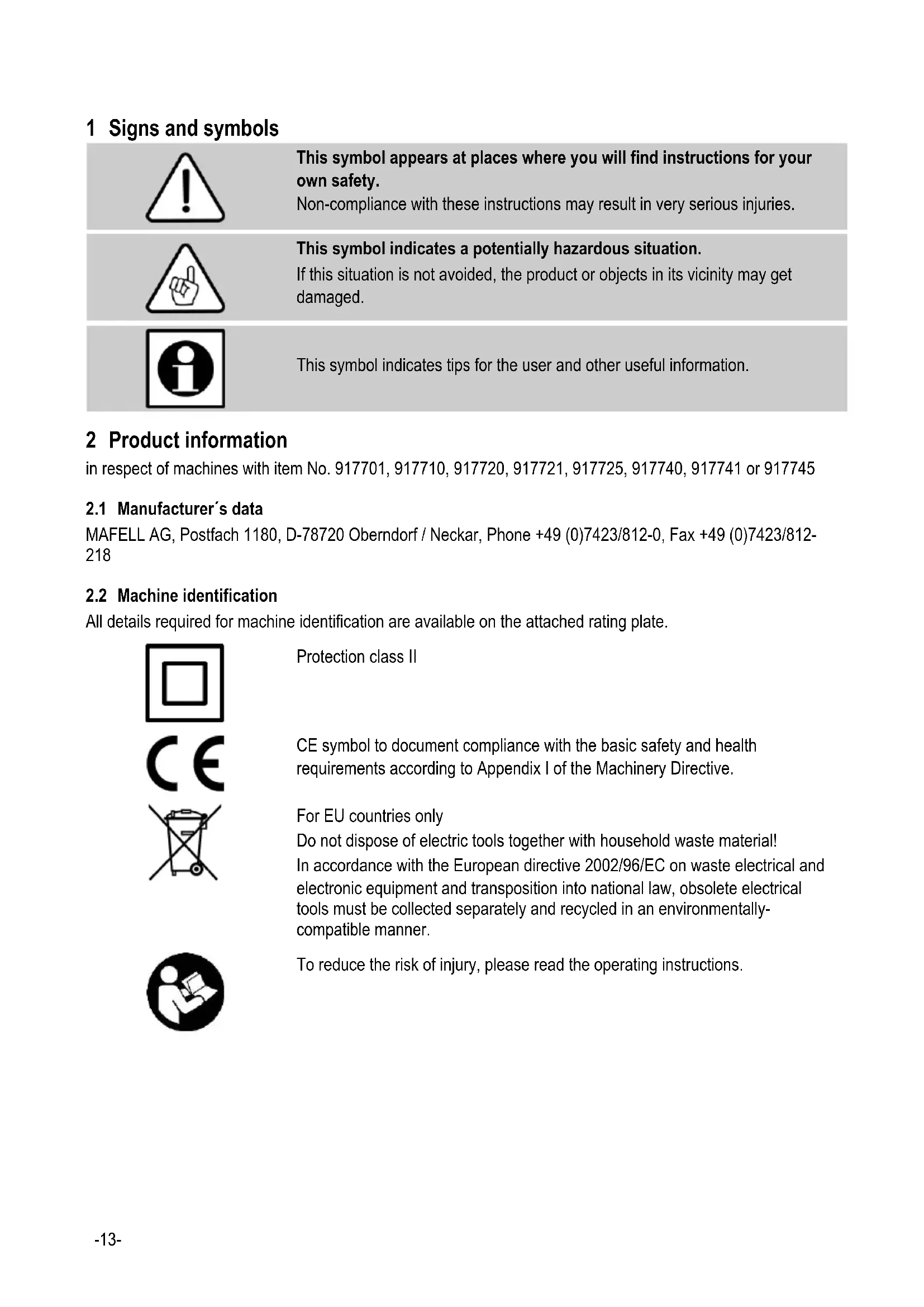 General instructions: - Children and adolescents must not operate this machine. This rule does not apply to young persons receiving training and being supervised by an expert. - Never work without the protection devices prescribed for the respective operating sequence and do not make any changes to the machine that could impair safety. - When operating the machine outdoors, use of an earth-leakage circuit-breaker is recommended. - Damaged cables or plugs must be immediately replaced. - Avoid sharp bends in the cable. Especially when transporting and storing the machine, do not wind the cable around the machine. Instructions on the use of personal protective equipment: - Always wear ear protectors during work. - Dust arising during work is often hazardous (e.g. when processing oak and beech wood, mineral materials, metal or coats of paint containing lead or other harmful substances) and should not enter the body. Do not touch or inhale the dust. Use a dust extraction and in addition wear a dust protection mask. Remove any deposited dust thoroughly, e.g. by vacuuming it with a special vacuum cleaner. Please also observe these instructions when changing the filter bag Instructions on operation: - Do not reach with your hands into the oscillation range of the abrasive grid or its mounting. With your other hand, support the supplementary handle or the motor casing. - Never support the workpiece in your hand or over your leg. Secure the workpiece against a sturdy support. - Whenever possible, secure the workpiece against slipping, e.g. with screw clamps. - Provide for an unobstructed and slip-proof location with adequate lighting. - Only use abrasive grids with the dimensions specified in these operating instructions. Instructions on service and maintenance: - Regularly cleaning the machine, especially the adjusting devices and guides, constitutes an important safety factor. - Only original MAFELL spare parts and accessories may be used. Otherwise the manufacturer will not accept any warranty claims and cannot be held liable.