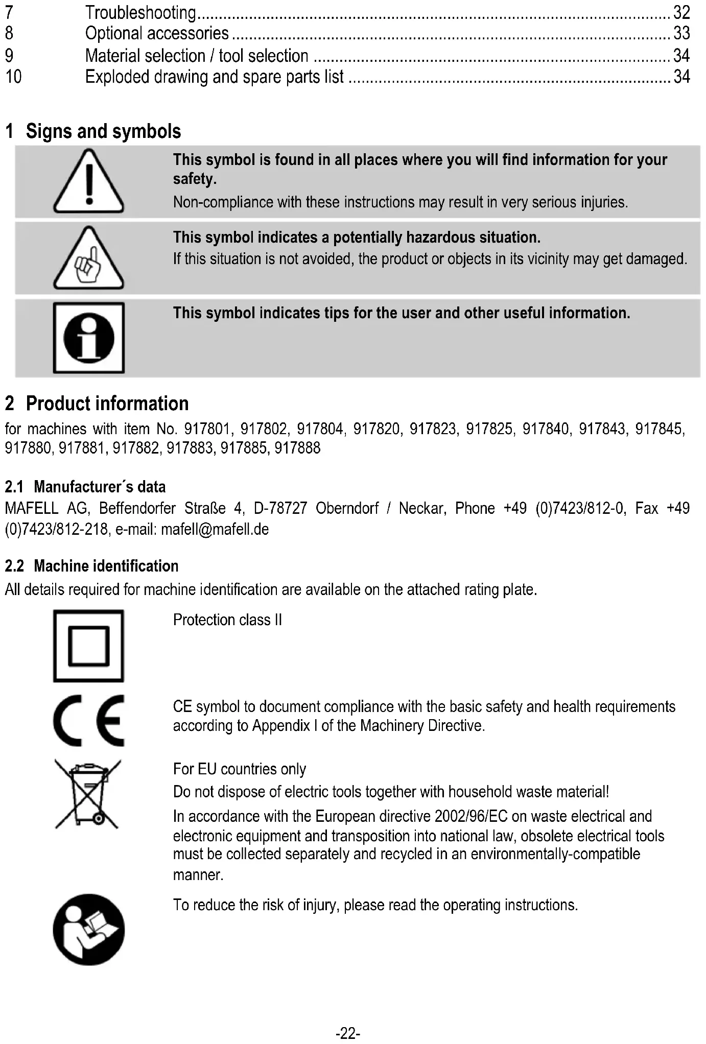 The groove-cutting machine is exclusively suited for longitudinal and cross cutting as well as for milling solid wood, panel materials such as chip board, coreboard, MDF board, gypsum plasterboard, aluminium compound panels and laminate panels. Special use of the tools: - The saw blade is exclusively suited for processing wood, plaster board panels, aluminium compound and laminate panels. - The slitting unit (special accessories) is exclusively suited for processing wood and plaster board panels. - The adjustable groove cutter is exclusively suited for machining wood. - The plasterboard milling cutter is exclusively suited for processing wood and plaster board panels. - The aluminium compound milling cutter is exclusively suited for machining aluminium compound panels. Only use the approved tools. Our tools are manufactured according to EN 847-1. Any other use than described above is not permissible. The manufacturer cannot be held liable for any damage arising from such other use. To use the machine as intended, comply with the operating, maintenance and servicing conditions prescribed by Mafell.