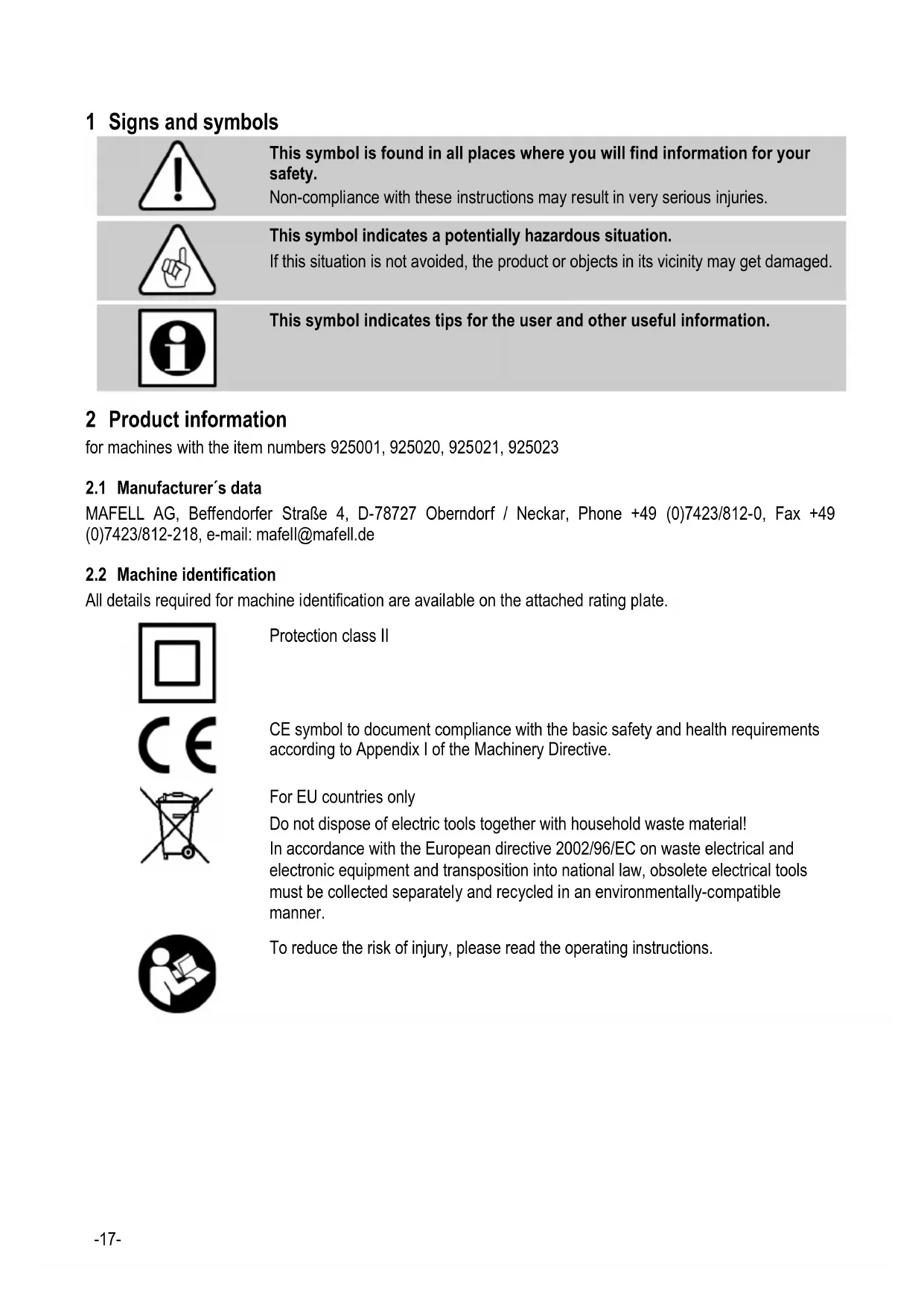 This symbol indicates tips for the user and other useful information. 2 Product information for machines with the item numbers 925001, 925020, 925021, 925023
