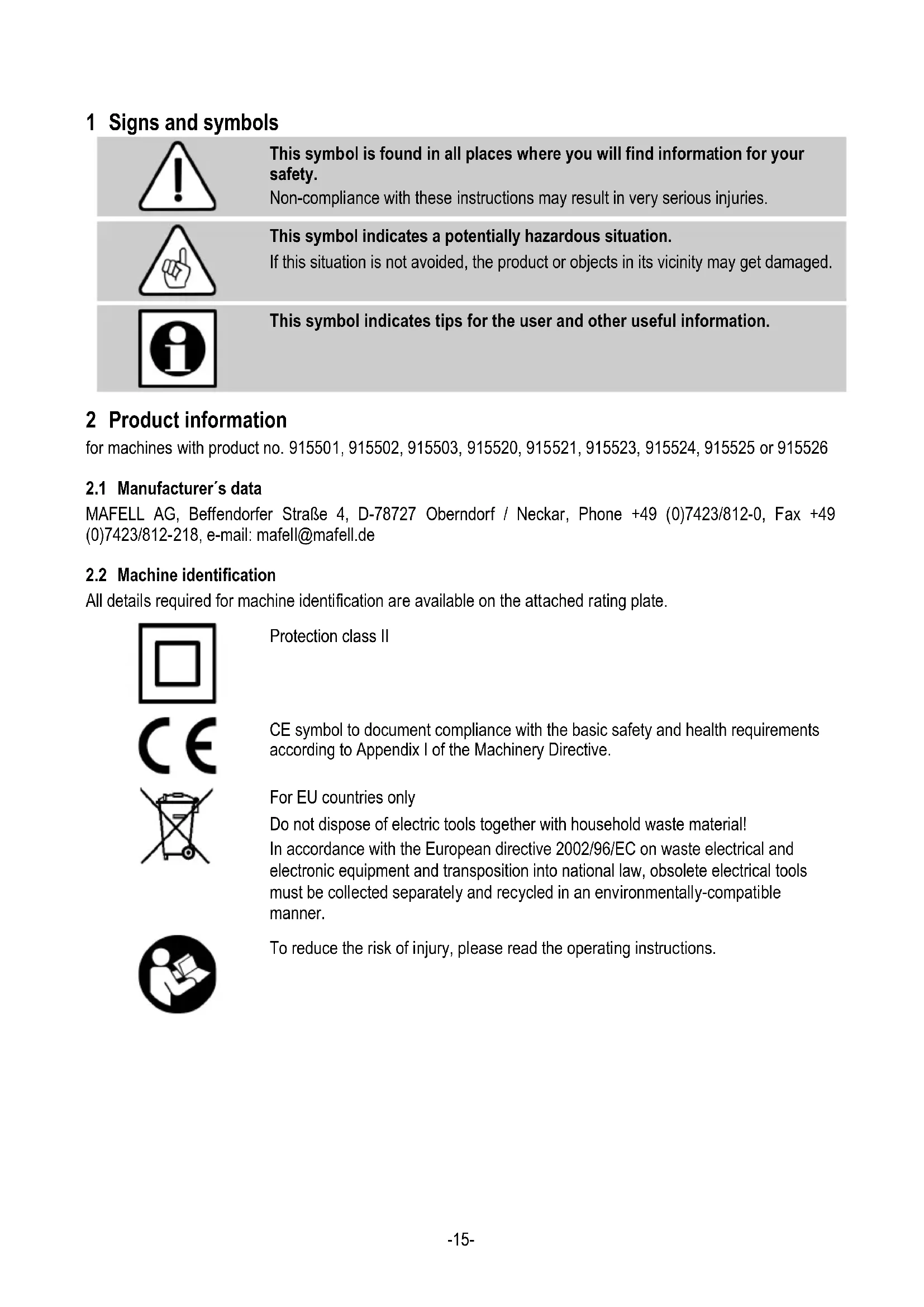 This symbol indicates tips for the user and other useful information. 2 Product information for machines with product no. 915501, 915502, 915503, 915520, 915521, 915523, 915524, 915525 or 915526