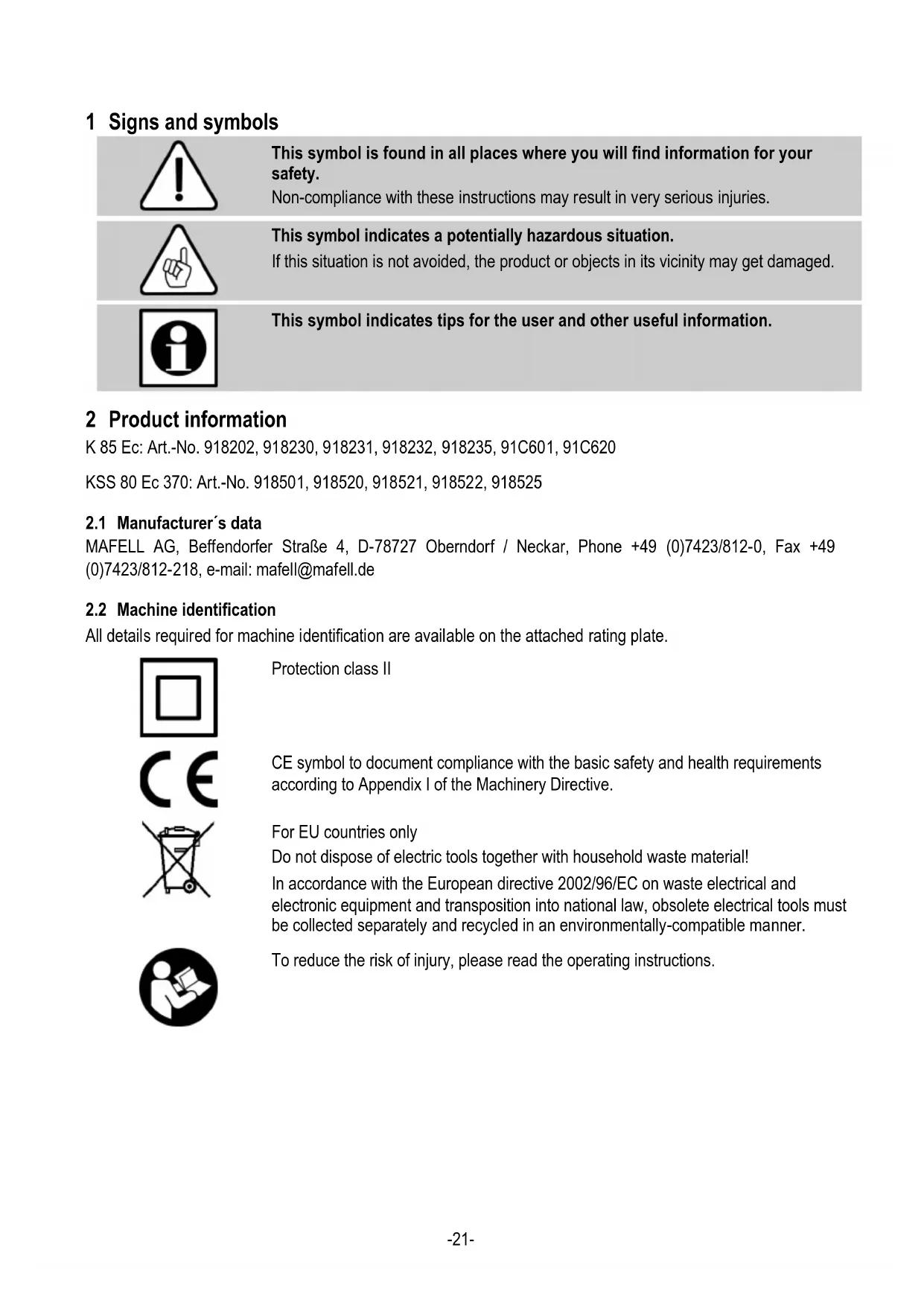 The K 85 Ec / KSS 80 Ec is exclusively suited for longitudinal and cross cutting of solid wood. Panel materials such as chip board, core board and medium density fibre board can also be processed. Use approved saw blades according to EN 847-1. Processing wood fibre insulation materials and synthetic materials (polystyrene) is also possible. Any other use than described above is not permissible. The manufacturer cannot be held liable for any damage arising from such other use. So as to use the machine as intended, comply with the operating, maintenance and repair instructions specified by Mafell.