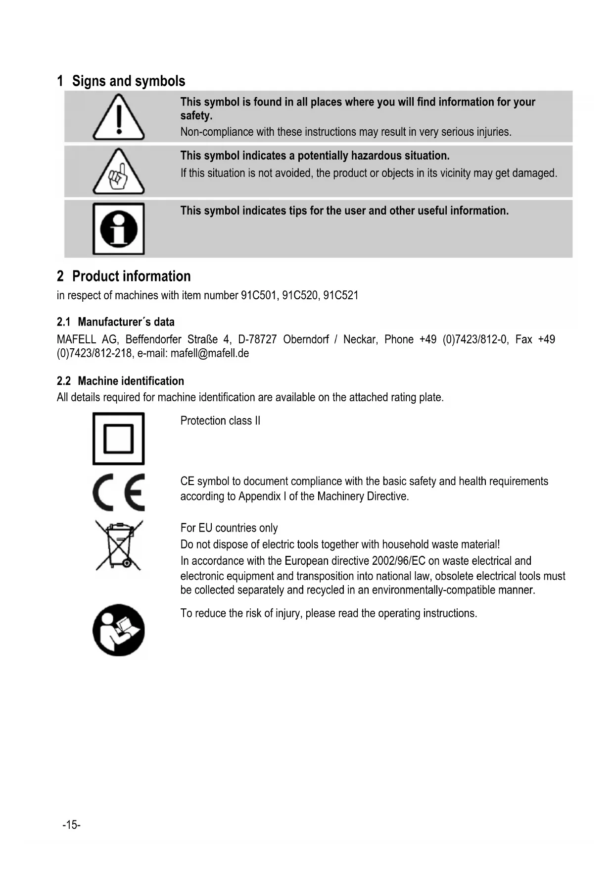 General instructions: - Children and adolescents must not operate this machine. This rule does not apply to young persons receiving training and being supervised by an expert. - Never work without the protection devices stipulated for the respective operating sequence and do not effect any modifications on the machine that could impair safety. - Damaged cables or plugs must be immediately replaced. Replacement may only be carried out by MAFELL or an authorised MAFELL service workshop in order to avoid safety hazards. - Avoid sharp bends in the cable. Do not wind the cable around the milling motor especially when transporting and storing the milling motor.-18- Machine-specific safety instructions: - Only hold the power tool by the isolated handles, as the milling tool could encounter and cut into its own connecting cable. Cutting accessory contacting a "live" wire may make exposed metal parts of the power tool "live" and could give the operator an electric shock. - Only operate the machine with a correctly fitted milling table and extraction hood. - Only use milling tools approved for at least 25,000 rpm according to EN 847. - Ensure that the milling tool is firmly seated and check that it is running smoothly. Do not use: - Damaged tools or tools that have changed their shape. - Blunt tools due to the excessive motor load. - Tools that are not suitable for the milling motor speed during idling. Instructions on the use of personal protective equipment: - Always wear ear protectors during work. - Always where a dust mark during work. - Always wear protective goggles during work. Instructions on operation: - Do not reach with your hands into the danger zone of the tool. - Examine the workpiece for foreign objects. - Never support the workpiece in your hand or over your leg. Secure the workpiece against a sturdy support. Instructions on service and maintenance: - Regular cleaning of the milling motor is an important safety factor. - Only original MAFELL spare parts and accessories may be used. Otherwise, the manufacturer will not accept any warranty claims and cannot be held liable. 4 Setting / Adjustment