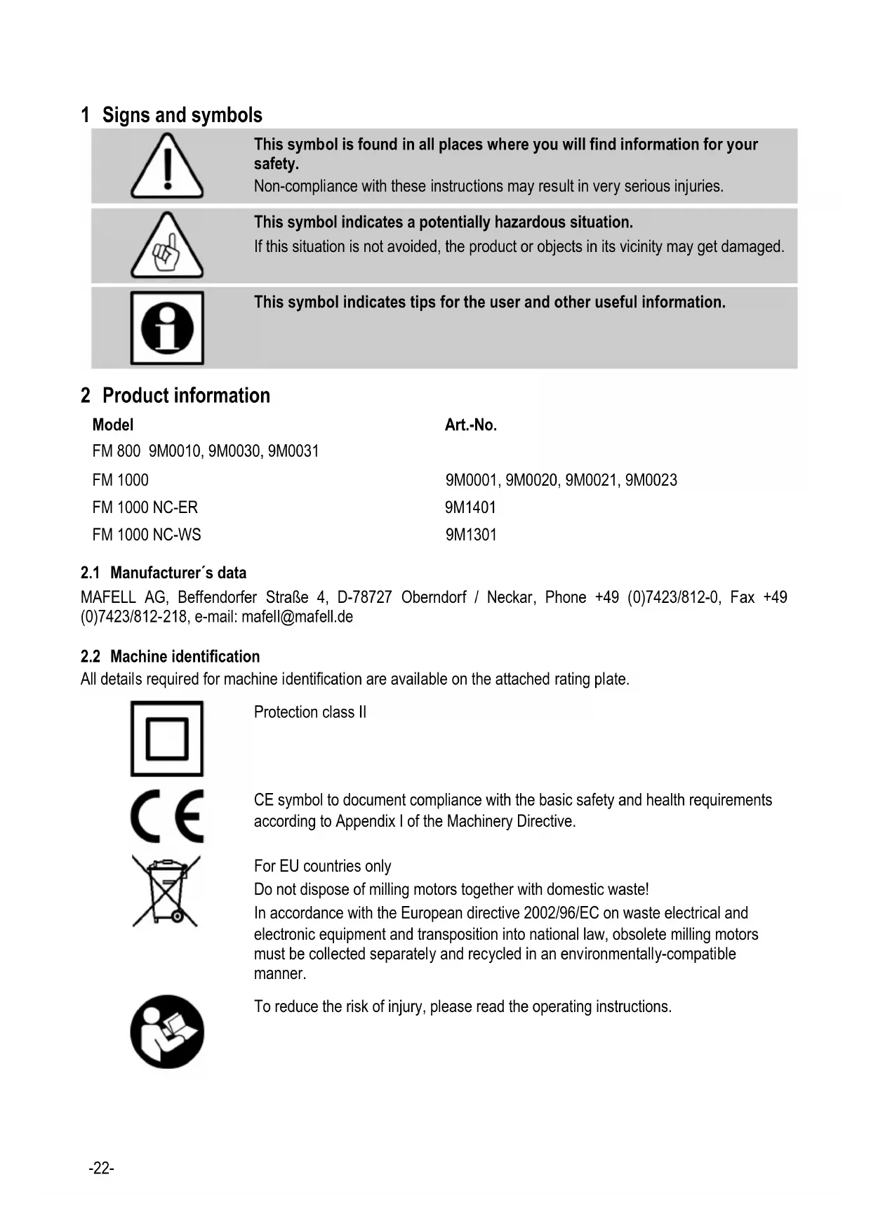 This symbol indicates tips for the user and other useful information. 2 Product information Model Art.-No. FM 800 9M0010, 9M0030, 9M0031 FM 1000 9M0001, 9M0020, 9M0021, 9M0023 FM 1000 NC-ER 9M1401 FM 1000 NC-WS 9M1301