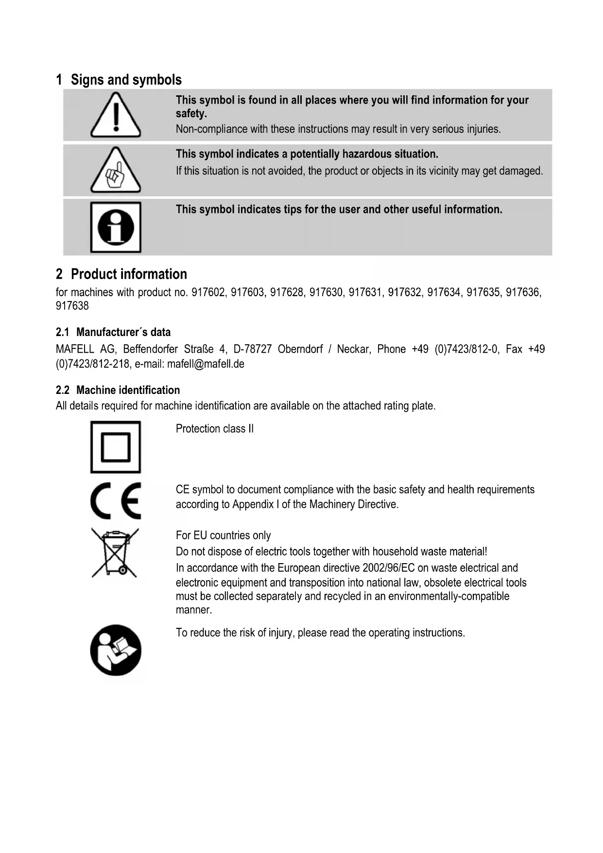 This symbol indicates tips for the user and other useful information. 2 Product information for machines with product no. 917602, 917603, 917628, 917630, 917631, 917632, 917634, 917635, 917636,