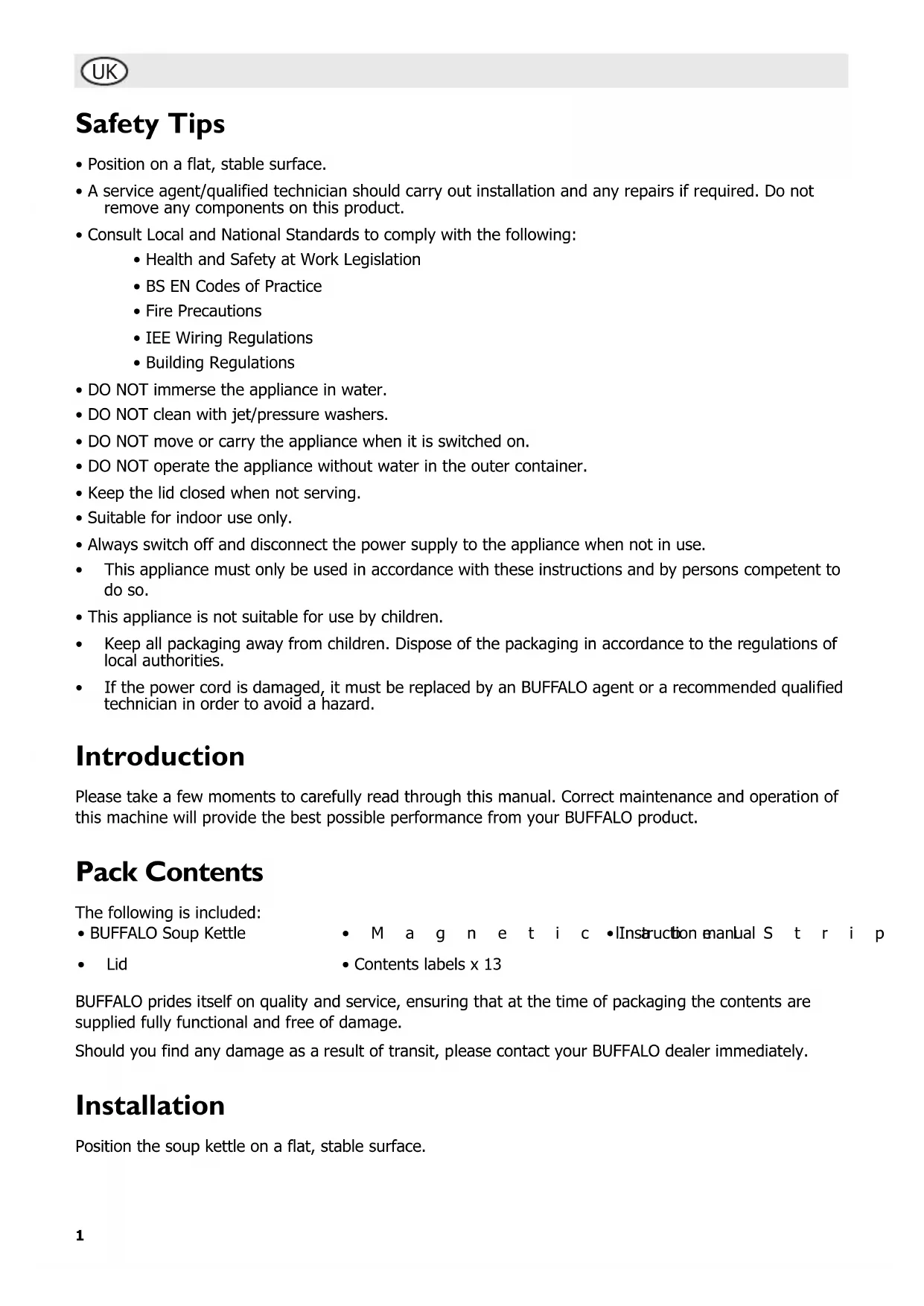 - If the power cord is damaged, it must be replaced by an BUFFALO agent or a recommended qualified technician in order to avoid a hazard. Introduction Please take a few moments to carefully read through this manual. Correct maintenance and operation of this machine will provide the best possible performance from your BUFFALO product. Pack Contents The following is included: BUFFALO prides itself on quality and service, ensuring that at the time of packaging the contents are supplied fully functional and free of damage. Should you find any damage as a result of transit, please contact your BUFFALO dealer immediately. Installation Position the soup kettle on a flat, stable surface.