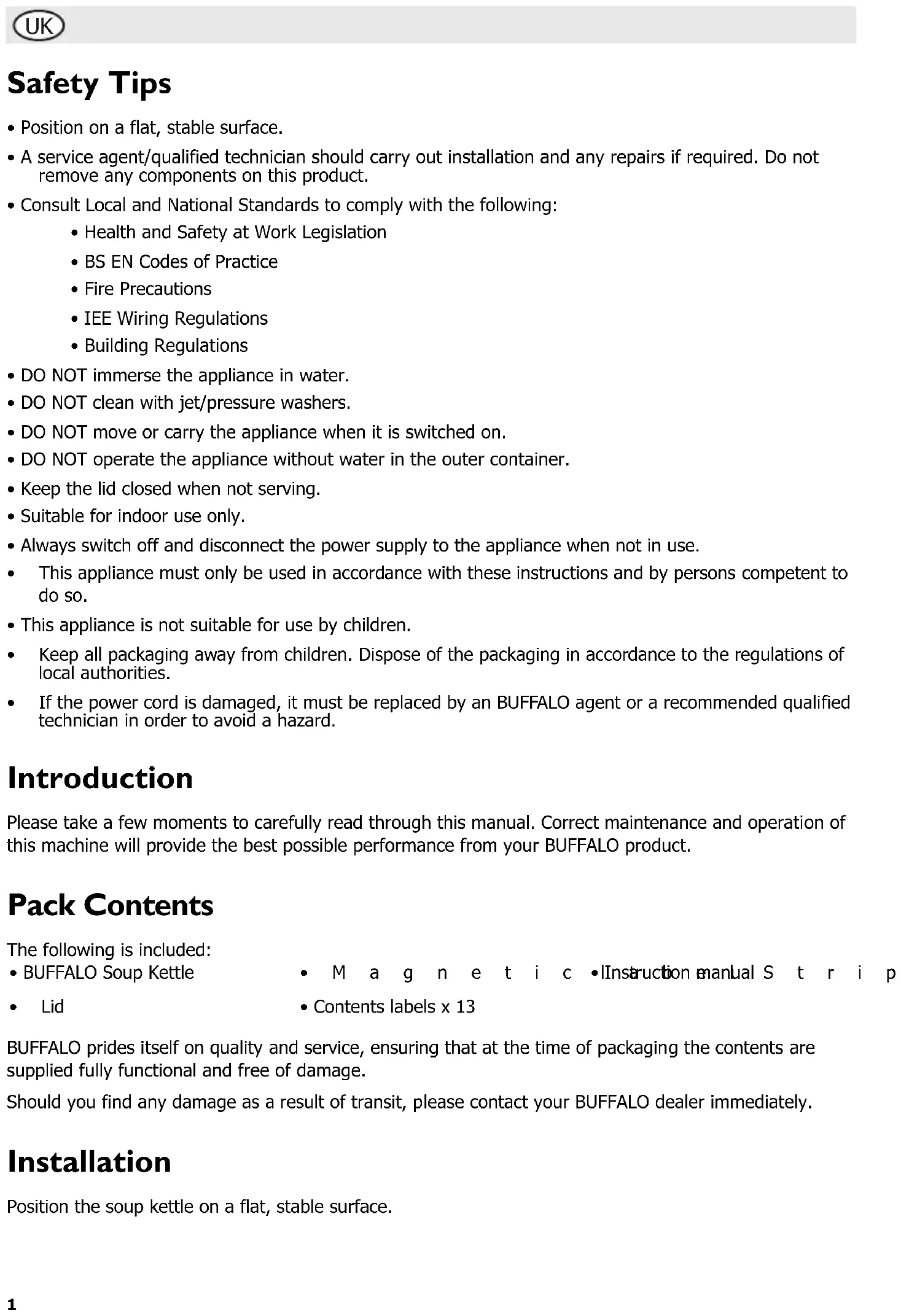 - If the power cord is damaged, it must be replaced by an BUFFALO agent or a recommended qualified technician in order to avoid a hazard. Introduction Please take a few moments to carefully read through this manual. Correct maintenance and operation of this machine will provide the best possible performance from your BUFFALO product. Pack Contents The following is included: BUFFALO prides itself on quality and service, ensuring that at the time of packaging the contents are supplied fully functional and free of damage. Should you find any damage as a result of transit, please contact your BUFFALO dealer immediately. Installation Position the soup kettle on a flat, stable surface.