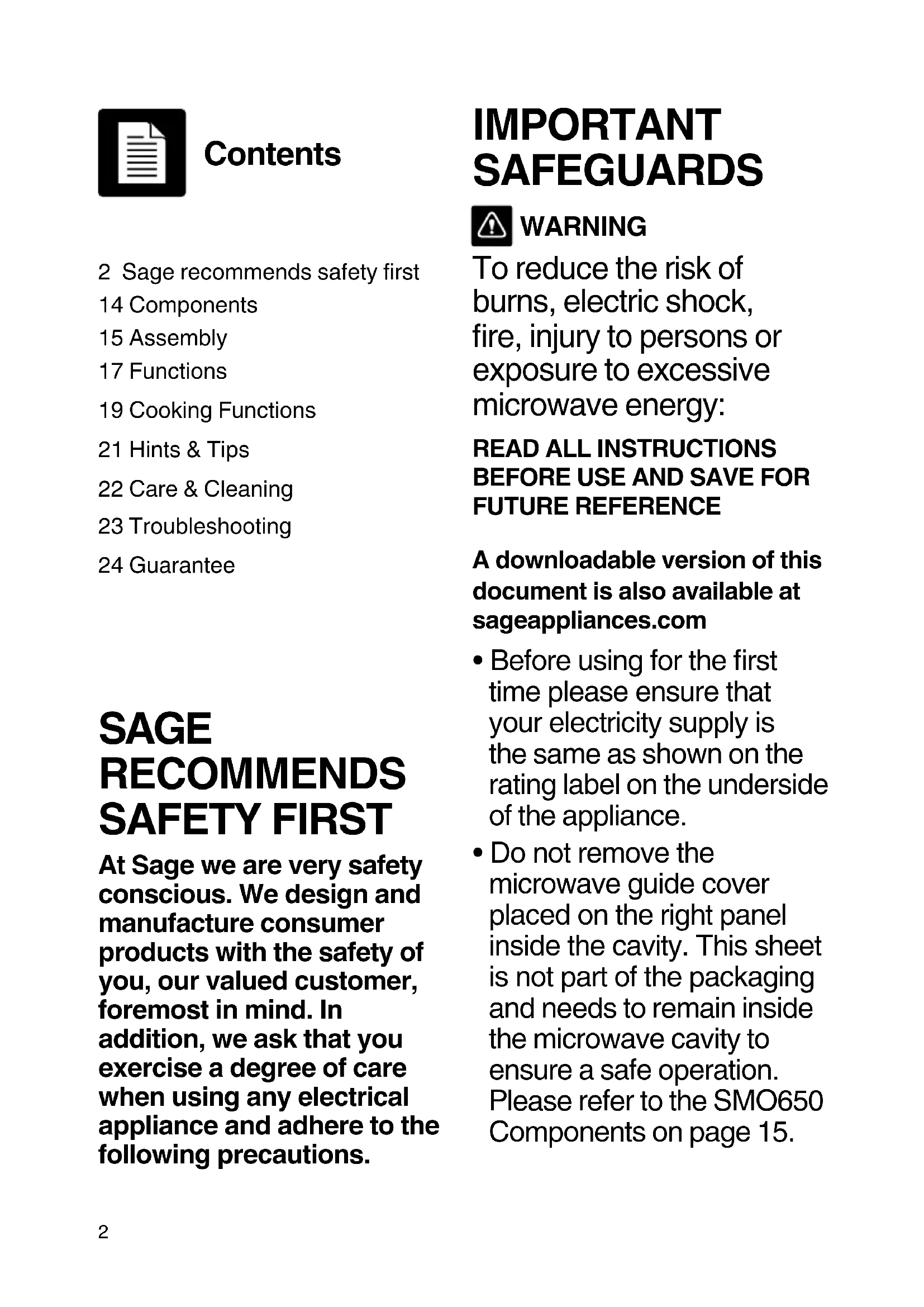 - Do not remove the microwave guide cover placed on the right panel inside the cavity. This sheet is not part of the packaging and needs to remain inside the microwave cavity to ensure a safe operation. Please refer to the SMO650 Components on page 15. 2 Sage recommends safety first14 Components15 Assembly17 Functions19 Cooking Functions21 Hints & Tips22 Care & Cleaning23 Troubleshooting24 Guarantee Contents3