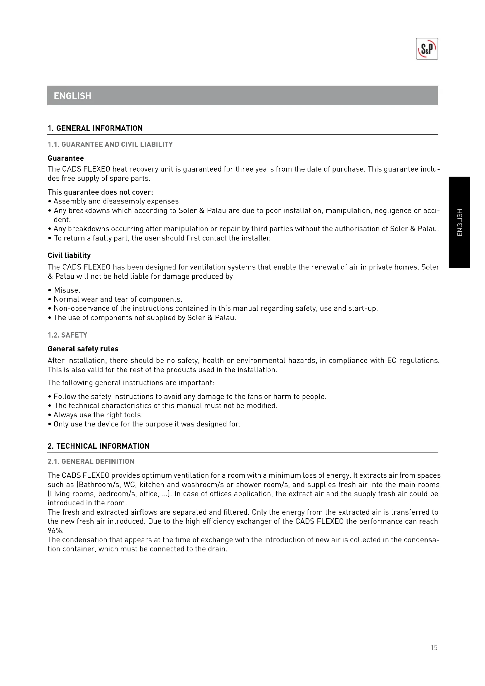 - To return a faulty part, the user should fi rst contact the installer. Civil liability The CADS FLEXEO has been designed for ventilation systems that enable the renewal of air in private homes. Soler & Palau will not be held liable for damage produced by: