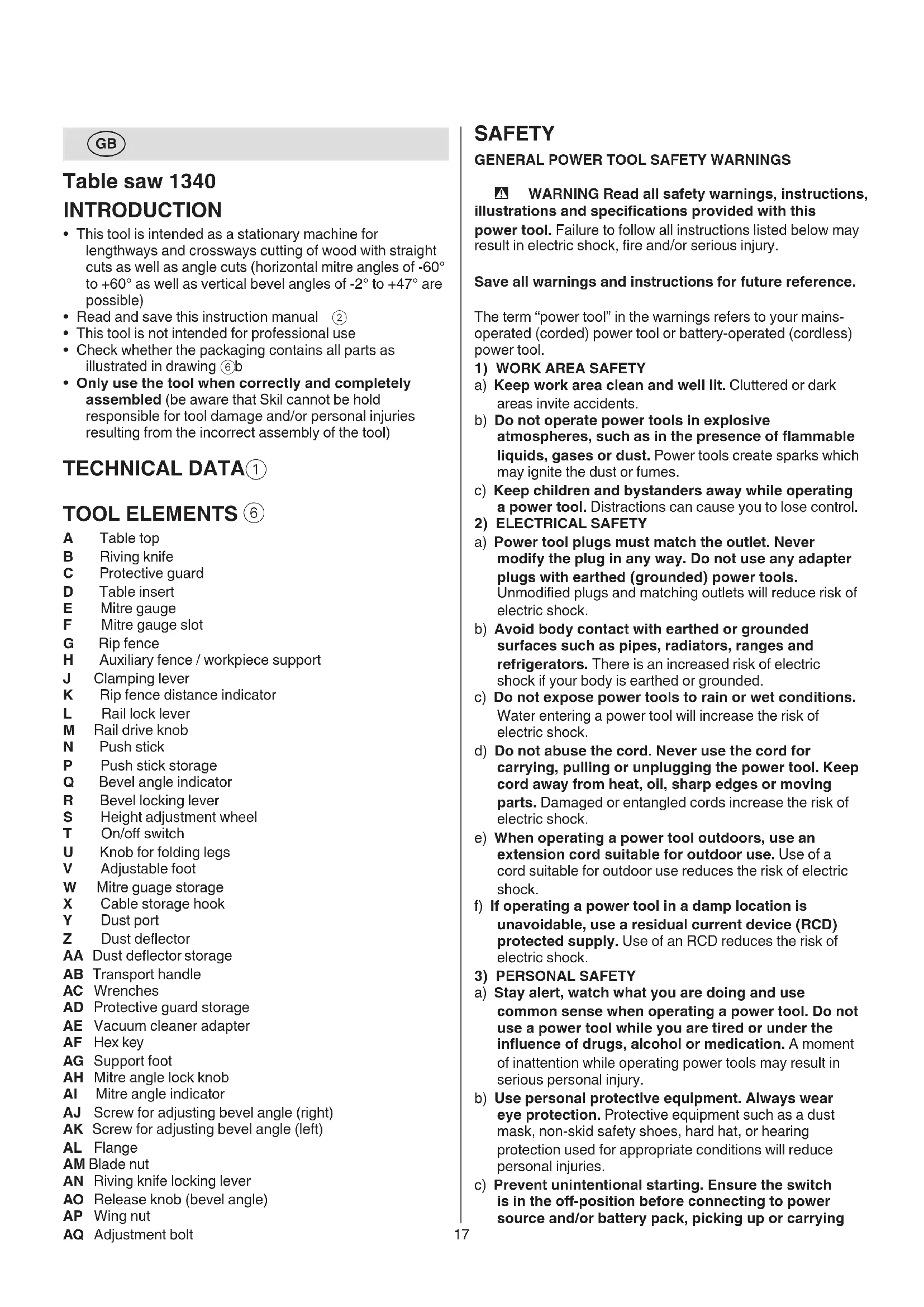 A Table top B Riving knife C Protective guard D Table insert E Mitre gauge F Mitre gauge slot G Rip fence H Auxiliary fence / workpiece support J Clamping lever K Rip fence distance indicator L Rail lock lever M Rail drive knob N Push stick P Push stick storage Q Bevel angle indicator R Bevel locking lever S Height adjustment wheel T On/o switch U Knob for folding legs V Adjustable foot W Mitre guage storage X Cable storage hook Y Dust port Z Dust deector AA Dust deector storage AB Transport handle AC Wrenches AD Protective guard storage AE Vacuum cleaner adapter AF Hex key AG Support foot AH Mitre angle lock knob AI Mitre angle indicator AJ Screw for adjusting bevel angle (right) AK Screw for adjusting bevel angle (left) AL Flange AM Blade nut AN Riving knife locking lever AO Release knob (bevel angle) AP Wing nut AQ Adjustment bolt18