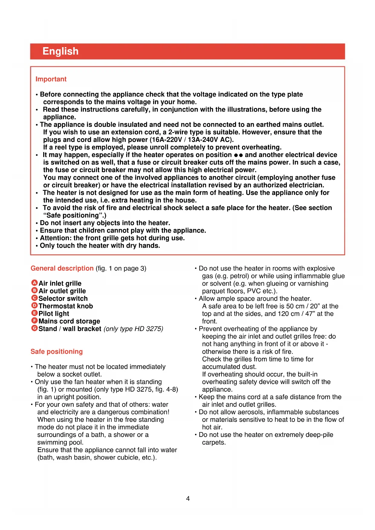 Thermostat knob (D) With the thermostat knob you can set a constant room temperature. When the selector switch is set to position 1 or position 2, the heater will automatically switch on (using half power or full power respectively) as soon as the room temperature falls below the set temperature. As soon as the set temperature is reached, the heater will switch off. Rotate the knob anti-clockwise to obtain a higher temperature setting or clockwise for a lower temperature setting. You may adjust the thermostat during use. To find the ideal thermostat setting: - First set the knob to maximum position. (Rotate anti-clockwise until the knob stops.) - As soon as the temperature is comfortable, turn the knob clockwise slowly until the heater goes off. y = "Frost-free" position. This position corresponds with the minimum thermostat setting (i.e. approx. +5 °C / +41 °F) and can be used to keep the immediate vicinity of the heater free from frost. E.g. to prevent pipes from freezing, position the heater close to the pipe and select this position. Please note: When using the cool air setting >, the thermostat knob should be in its highest position. Pilot light - When the appliance is connected to the mains and switched on by selecting >, 1 or 2 the pilot light (E) will come on. - The light will stay on until the appliance is switched off by setting the selector switch (C) to position O or by disconnecting from the mains. - To indicate that the heater is still connected and in "switched-on" position (>, 1 or 2), the pilot light will remain on when the set temperature is reached and the thermostat switches the appliance off. For the same reason the pilot light will remain on when the overheating safety device switches the appliance off. Overheating safety device To prevent damage and risks due to overheating, the built-in overheating safety device cuts off the power as soon as the heating elements become too hot. If this should happen: - First ensure that it was not the thermostat which has switched off the heater. Set the thermostat to maximum position. If the heater does not switch on, the safety device has been activated. - Remove the mains plug from the wall socket. - Let the heater cool down for 30 minutes. - Check if the heater had been placed correctly. - Check if anything is obstructing the air flow. If necessary, clean the grilles with a vacuum cleaner. - Replace the plug into the wall socket and switch the heater on again. If the safety device again switches off the heater: - Remove the mains plug from the wall socket. - Have the heater inspected by a Philips Service Centre or by your dealer. Cleaning - Set the selector switch (C) to position O to switch off. - Remove the mains plug from the wall socket. - Wait for the heater to cool down sufficiently. - You may clean the outside of the heater with a damp cloth. Do not allow water to come into the appliance. - Clean the air inlet and outlet grilles regularly (with normal use at least twice a year) with a vacuum cleaner, using the brush attachment.7 Description générale (fig. 1, page 3) A Grille entrée d'air B Grille sortie d'air C Commutateur D Thermostat E Témoin lumineux F Rangement du cordon G Base / support mural (Type HD 3275 uniquement) Positionnement de sécurité