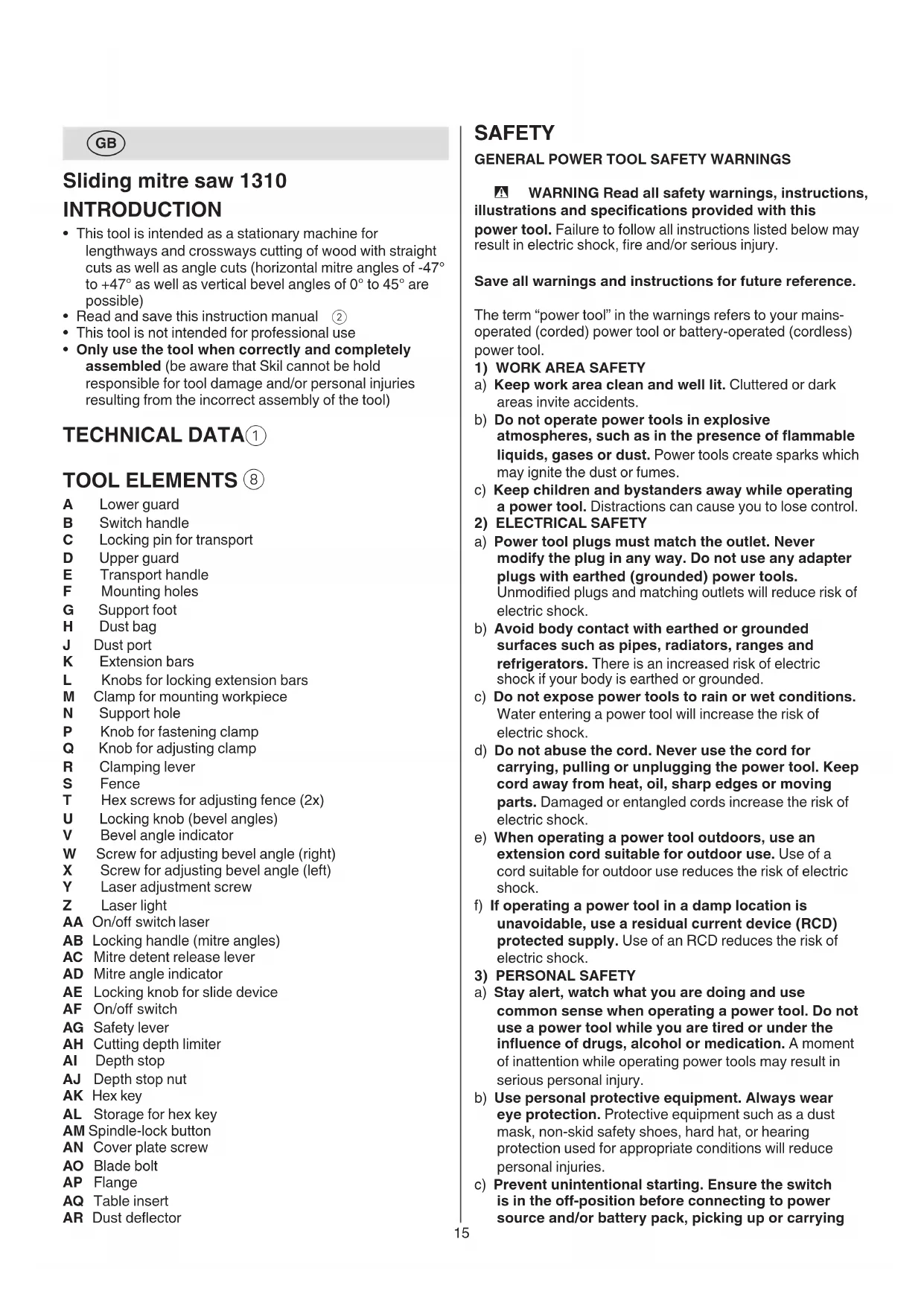 A Lower guard B Switch handle C Locking pin for transport D Upper guard E Transport handle F Mounting holes G Support foot H Dust bag J Dust port K Extension bars L Knobs for locking extension bars M Clamp for mounting workpiece N Support hole P Knob for fastening clamp Q Knob for adjusting clamp R Clamping lever S Fence T Hex screws for adjusting fence (2x) U Locking knob (bevel angles) V Bevel angle indicator W Screw for adjusting bevel angle (right) X Screw for adjusting bevel angle (left) Y Laser adjustment screw Z Laser light AA On/o switch laser AB Locking handle (mitre angles) AC Mitre detent release lever AD Mitre angle indicator AE Locking knob for slide device AF On/o switch AG Safety lever AH Cutting depth limiter AI Depth stop AJ Depth stop nut AK Hex key AL Storage for hex key AM Spindle-lock button AN Cover plate screw AO Blade bolt AP Flange AQ Table insert AR Dust deector16