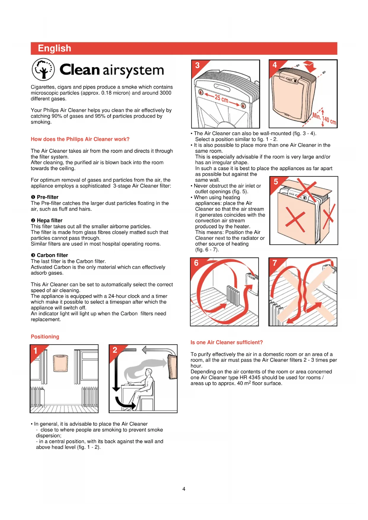 E• The Air Cleaner can also be wall-mounted (fig. 3 - 4). Select a position similar to fig. 1 - 2. • It is also possible to place more than one Air Cleaner in thesame room. This is especially advisable if the room is very large and/orhas an irregular shape. In such a case it is best to place the appliances as far apartas possible but against thesame wall.• Never obstruct the air inlet oroutlet openings (fig. 5).• When using heatingappliances: place the AirCleaner so that the air streamit generates coincides with theconvection air streamproduced by the heater. This means: Position the AirCleaner next to the radiator orother source of heating (fig. 6 - 7).Is one Air Cleaner sufficient?To purify effectively the air in a domestic room or an area of aroom, all the air must pass the Air Cleaner filters 2 - 3 times perhour.Depending on the air contents of the room or area concernedone Air Cleaner type HR 4345 should be used for rooms /areas up to approx. 40 m floor surface.Cigarettes, cigars and pipes produce a smoke which containsmicroscopic particles (approx. 0.18 micron) and around 3000different gases.Your Philips Air Cleaner helps you clean the air effectively bycatching 90% of gases and 95% of particles produced bysmoking.How does the Philips Air Cleaner work?The Air Cleaner takes air from the room and directs it throughthe filter system.After cleaning, the purified air is blown back into the roomtowards the ceiling.For optimum removal of gases and particles from the air, theappliance employs a sophisticated 3-stage Air Cleaner filter:❶ Pre-filterThe Pre-filter catches the larger dust particles floating in theair, such as fluff and hairs.❷ Hepa filterThis filter takes out all the smaller airborne particles.The filter is made from glass fibres closely matted such thatparticles cannot pass through. Similar filters are used in most hospital operating rooms.❸ Carbon filterThe last filter is the Carbon filter. Activated Carbon is the only material which can effectivelyadsorb gases.This Air Cleaner can be set to automatically select the correctspeed of air cleaning.The appliance is equipped with a 24-hour clock and a timerwhich make it possible to select a timespan after which theappliance will switch off.An indicator light will light up when the Carbon filters needreplacement.Positioning• In general, it is advisable to place the Air Cleaner- close to where people are smoking to prevent smokedispersion;- in a central position, with its back against the wall andabove head level (fig. 1 - 2). English