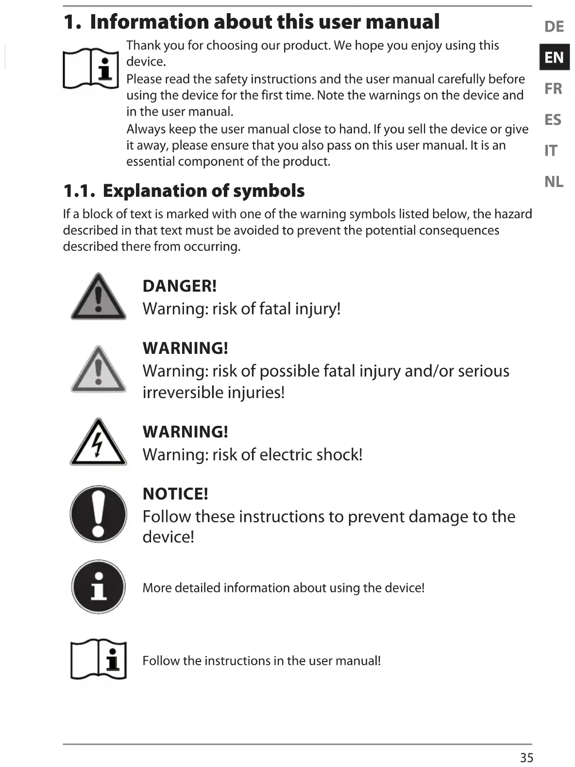 Thank you for choosing our product. We hope you enjoy using this device. Please read the safety instructions and the user manual carefully before using the device for the first time. Note the warnings on the device and in the user manual. Always keep the user manual close to hand. If you sell the device or give it away, please ensure that you also pass on this user manual. It is an essential component of the product. 1.1. Explanation of symbols If a block of text is marked with one of the warning symbols listed below, the hazard described in that text must be avoided to prevent the potential consequences described there from occurring. DANGER!