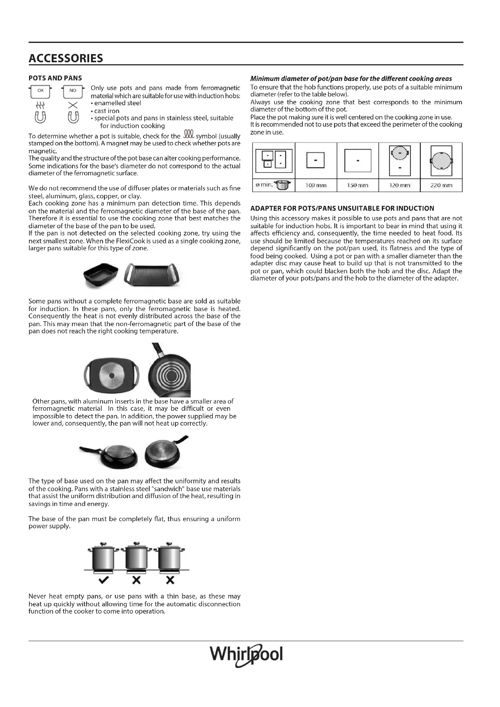 - special pots and pans in stainless steel, suitable for induction cooking To determine whether a pot is suitable, check for the symbol (usually stamped on the bottom). A magnet may be used to check whether pots are magnetic. The quality and the structure of the pot base can alter cooking performance. Some indications for the base's diameter do not correspond to the actual diameter of the ferromagnetic surface. We do not recommend the use of diuser plates or materials such as ne steel, aluminum, glass, copper, or clay. Each cooking zone has a minimum pan detection time. This depends on the material and the ferromagnetic diameter of the base of the pan. Therefore it is essential to use the cooking zone that best matches the diameter of the base of the pan to be used. If the pan is not detected on the selected cooking zone, try using the next smallest zone. When the FlexiCook is used as a single cooking zone, larger pans suitable for this type of zone. Some pans without a complete ferromagnetic base are sold as suitable for induction. In these pans, only the ferromagnetic base is heated. Consequently the heat is not evenly distributed across the base of the pan. This may mean that the non-ferromagnetic part of the base of the pan does not reach the right cooking temperature. Other pans, with aluminum inserts in the base have a smaller area of ferromagnetic material In this case, it may be difficult or even impossible to detect the pan. In addition, the power supplied may be lower and, consequently, the pan will not heat up correctly. The type of base used on the pan may aect the uniformity and results of the cooking. Pans with a stainless steel "sandwich" base use materials that assist the uniform distribution and diusion of the heat, resulting in savings in time and energy. The base of the pan must be completely at, thus ensuring a uniform power supply. Never heat empty pans, or use pans with a thin base, as these may heat up quickly without allowing time for the automatic disconnection function of the cooker to come into operation. NOOK Minimum diameter of pot/pan base for the dierent cooking areas To ensure that the hob functions properly, use pots of a suitable minimum diameter (refer to the table below). Always use the cooking zone that best corresponds to the minimum diameter of the bottom of the pot. Place the pot making sure it is well centered on the cooking zone in use. It is recommended not to use pots that exceed the perimeter of the cooking zone in use. ADAPTER FOR POTS/PANS UNSUITABLE FOR INDUCTION Using this accessory makes it possible to use pots and pans that are not suitable for induction hobs. It is important to bear in mind that using it aects eciency and, consequently, the time needed to heat food. Its use should be limited because the temperatures reached on its surface depend signicantly on the pot/pan used, its atness and the type of food being cooked. Using a pot or pan with a smaller diameter than the adapter disc may cause heat to build up that is not transmitted to the pot or pan, which could blacken both the hob and the disc. Adapt the diameter of your pots/pans and the hob to the diameter of the adapter.FIRST TIME USE