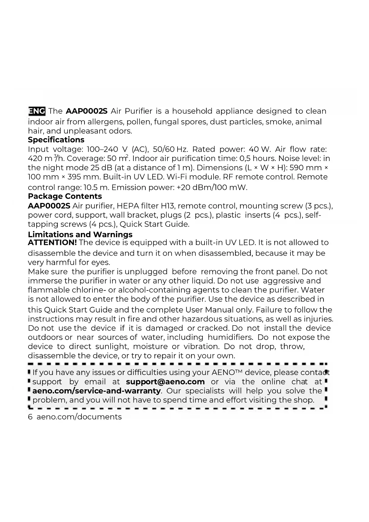 . Indoor air purification time: 0,5 hours. Noise level: in the night mode 25 dB (at a distance of 1 m). Dimensions (L × W × H): 590 mm × 100 mm × 395 mm. Built-in UV LED. Wi-Fi module. RF remote control. Remote control range: 10.5 m. Emission power: +20 dBm/100 mW. Package Contents AAP0002S Air purifier, HEPA filter H13, remote control, mounting screw (3 pcs.), power cord, support, wall bracket, plugs (2 pcs.), plastic inserts (4 pcs.), self- tapping screws (4 pcs.), Quick Start Guide. Limitations and Warnings ATTENTION! The device is equipped with a built-in UV LED. It is not allowed to disassemble the device and turn it on when disassembled, because it may be very harmful for eyes. Make sure the purifier is unplugged before removing the front panel. Do not immerse the purifier in water or any other liquid. Do not use aggressive and flammable chlorine- or alcohol-containing agents to clean the purifier. Water is not allowed to enter the body of the purifier. Use the device as described in this Quick Start Guide and the complete User Manual only. Failure to follow the instructions may result in fire and other hazardous situations, as well as injuries. Do not use the device if it is damaged or cracked. Do not install the device outdoors or near sources of water, including humidifiers. Do not expose the device to direct sunlight, moisture or vibration. Do not drop, throw, disassemble the device, or try to repair it on your own. If you have any issues or difficulties using your AENO™ device, please contact support by email at support@aeno.com or via the online chat at aeno.com/service-and-warranty. Our specialists will help you solve the problem, and you will not have to spend time and effort visiting the shop.aeno.com/documents 7 Do not lay the power cable near radiators, stoves, or heaters. Do not use cleaning agents or detergents to clean the device. Do not dispose of the device with unsorted urban waste, because this will be harmful for the environment. For more information on proper disposal, please contact your local waste collection and disposal company. Keep children away from the device. There is a risk of serious injury and electric shock. This device is intended for use by adults only. Warnings, precautions, and instructions contained herein may not contain every possible hazardous situation. Please use common sense when operating the device. Components of the Air Purifier (See Figure a) (1) – Air inlet, (2) – Removable front panel, (3) – HEPA filter, (4) – Plastic plugs, (5) – Purified air outlet, (6) – Casing, (7) – Mounting screws, (8) – Support, (9) – Wall mounting bracket. Initial Setup (See Figure a) Before operation, you should remove the packaging from the HEPA filter. To do this, first make sure that the air purifier is unplugged. Then, carefully remove the front panel (2) and pull the HEPA filter (3) out using the fabric strips. Remove the filter packaging and insert the HEPA filter (3) back into the device body. Close the front panel (2). There are two options to install the purifier as follows: On the support: Insert the plugs (4) in the open ends of the support (8). Attach the support with the three mounting screws (7) to the purifier casing (6). On the wall: Attach the wall bracket (9) to the wall as desired (at a height of at least 170cm from the floor). Screw the three mounting screws (7) into the back of the purifier casing (6). Insert the heads of the mounting screws (7) on the back of the purifier into the grooves of the wall bracket (9) attached to the wall.8 aeno.com/documents Button Panel Control (See Figure b) The room air quality indicator/timer display shows either the room air quality or the time period during which the purifier is switched on. The indicator shows that ultraviolet air purification process is ongoing. The speed button allows you to change the fan speed of the purifier every time you press it (The fan speed will be displayed by the air speed indicator ). The “Start/Stop” button is used to switch the purifier on and off. The Sleep Mode button is used to switch the purifier into the Sleep Mode at a minimum fan speed where all indicators go out except for the Sleep Mode button. To exit this mode, press the button again. The Automatic Mode button is used to start one of the three available modes of operation of the purifier based on the room air quality. The Wi-Fi button is used to activate the Wi-Fi Module of the purifier to control it remotely from a smartphone. For more information, see the AENO app connection process described in the User manual available at aeno.com/documents. The indicator changes its colour depending on the level of air pollution by organic compounds (glues, paints, varnishes, solvents, etc.). The timer button is used to switch the air quality indicator to the timer mode. By additional clicks on this button, you may set the timer for the purifier operation: from 1 to 24 hours. The Child Lock button will be activated, if pressed and clicked for 3 seconds. As a result, all buttons become unavailable for control. To enable the buttons, you need to press and hold this button for 3 seconds again. The ioniser button is used to switch on the ionizer which helps to remove unpleasant odors. The filter reset button indicates the time to replace the HEPA filter. Press and hold this button for 10 seconds to stop flashing, the timer set for the service life of the HEPA filter will start from zero. Controlling the air purifier using the remote control (See Figure c) The following buttons are available on the remote control: Switching on/off , Sleeping Mode , Timer , Automatic Mode , Fan Speed .aeno.com/documents 9 Troubleshooting The purifier does not turn on. Possible causes and solutions: Make sure that the purifier is plugged into the mains socket, and that there is no power supply failure, as well as that the circuit breaker is on, and that the fuses are intact, and that the filter change LED is blinki
