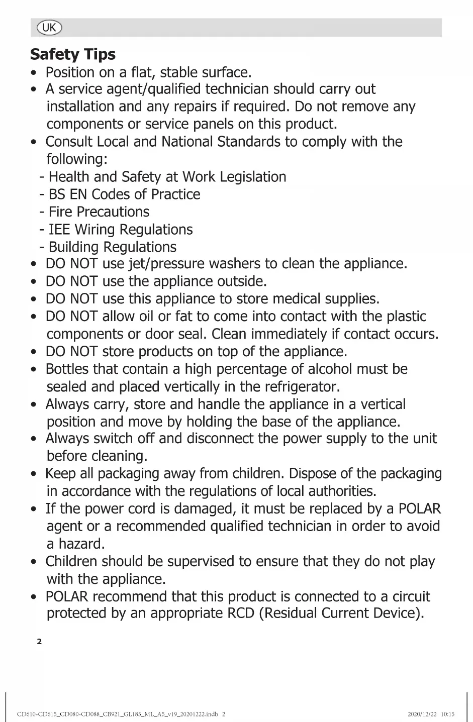- Earth wire (coloured green/yellow) to terminal marked E This appliance must be earthed. If in doubt consult a qualified electrician. Electrical isolation points must be kept clear of any obstructions. In the event of any emergency disconnection being required they must be readily accessible. Disposal EU regulations require refrigeration product to be disposed of by specialist companies who remove or recycle all gasses, metal and plastic components. Consult your local waste collection authority regarding disposal of your appliance. Local authorities are not obliged to dispose of commercial refrigeration equipment but may be able to offer advice on how to dispose of the equipment locally. Alternatively call the POLAR helpline for details of national disposal companies within the EU. Compliance The WEEE logo on this product or its documentation indicates that the product must not be disposed of as household waste. To help prevent possible harm to human health and/or the environment, the product must be disposed of in an approved and environmentally safe recycling process. For further information on how to dispose of this product correctly, contact the product supplier, or the local authority responsible for waste disposal in your area. POLAR parts have undergone strict product testing in order to comply with regulatory standards and specifications set by international, independent, and federal authorities. POLAR products have been approved to carry the following symbol: All rights reserved. No part of these instructions may be produced or transmitted in any form or by any means, electronic, mechanical, photocopying, recording or otherwise, without the prior written permission of POLAR. Every effort is made to ensure all details are correct at the time of going to press, however, POLAR reserve the right to change specifications without notice. CD610-CD615_CD080-CD088_CB921_GL185_ML_A5_v19_20201222.indb 9CD610-CD615_CD080-CD088_CB921_GL185_ML_A5_v19_20201222.indb 9 2020/12/22 10:152020/12/22 10:1510