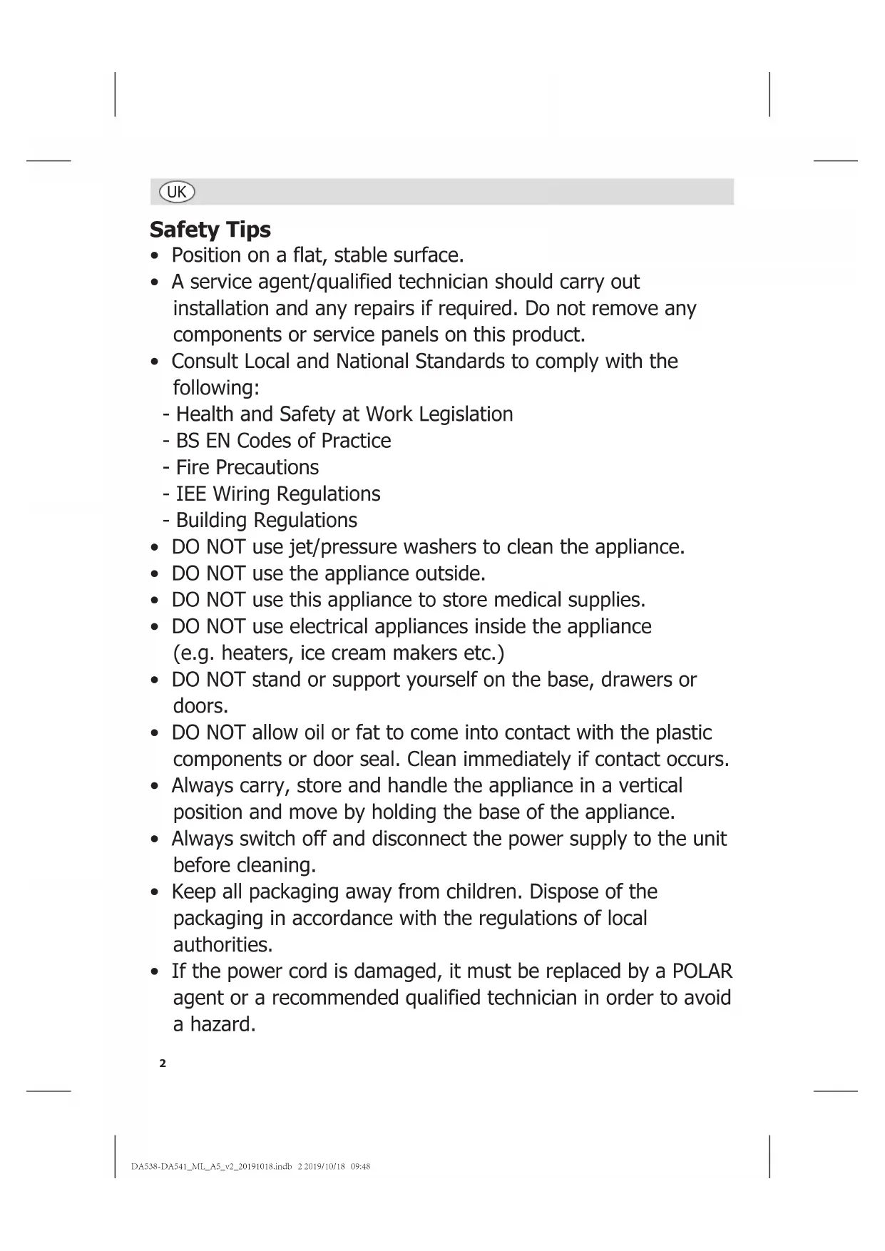 - If the power cord is damaged, it must be replaced by a POLAR agent or a recommended qualified technician in order to avoid a hazard. DA538-DA541_ML_A5_v2_20191018.indb 2 2019/10/18 09:483