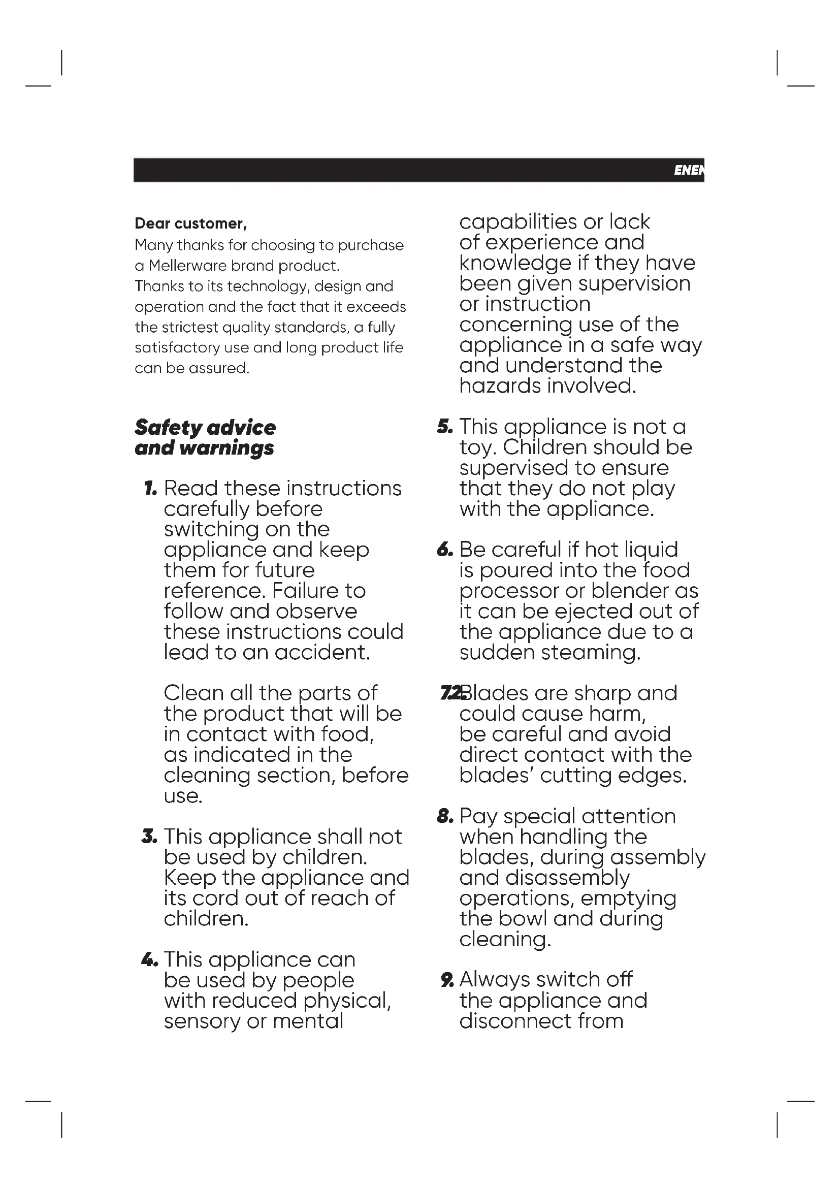CENENGLISH Dear customer, Many thanks for choosing to purchase a Mellerware brand product. Thanks to its technology, design and operation and the fact that it exceeds the strictest quality standards, a fully satisfactory use and long product life can be assured. Read these instructions carefully before switching on the appliance and keep them for future reference. Failure to follow and observe these instructions could lead to an accident. Clean all the parts of the product that will be in contact with food, as indicated in the cleaning section, before use. This appliance shall not be used by children. Keep the appliance and its cord out of reach of children. This appliance can be used by people with reduced physical, sensory or mental Safety advice and warnings capabilities or lack of experience and knowledge if they have been given supervision or instruction concerning use of the appliance in a safe way and understand the hazards involved. This appliance is not a toy. Children should be supervised to ensure that they do not play with the appliance. Be careful if hot liquid is poured into the food processor or blender as it can be ejected out of the appliance due to a sudden steaming. Blades are sharp and could cause harm, be careful and avoid direct contact with the blades’ cutting edges. Pay special attention when handling the blades, during assembly and disassembly operations, emptying the bowl and during cleaning. Always switch o the appliance and disconnect from